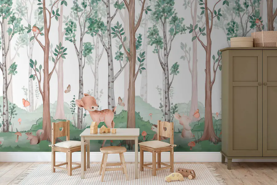 Verwandeln Sie Ihre Wände mit dieser charmanten Fototapete mit verspielten Tieren und hohen, flüsternden Bäumen in einen ruhigen Wald. Stellen Sie sich eine sanfte Brise vor, die die Blätter rascheln lässt, während neugierige Rehe und ausgelassene Hasen ihr Zuhause im Wald erkunden. Jeder Blick auf die sanften Farben dieses Wandbildes könnte Sie auf eine friedliche Lichtung entführen, wo sich alle Sorgen wie Morgennebel auflösen. Ideal für ein gemütliches Wohnzimmer oder ein skurriles Kinderzimmer, lädt es die Natur ins Haus ein und weckt Freude und Fantasie. Es ist, als hätte man ein kleines Stückchen Wald bei sich zu Hause – abgesehen von den Käfern und dem Schlamm, versteht sich! Im Ernst: Kann Dekoration noch gemütlicher sein?