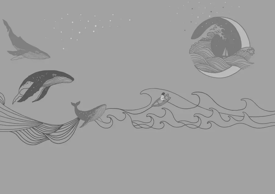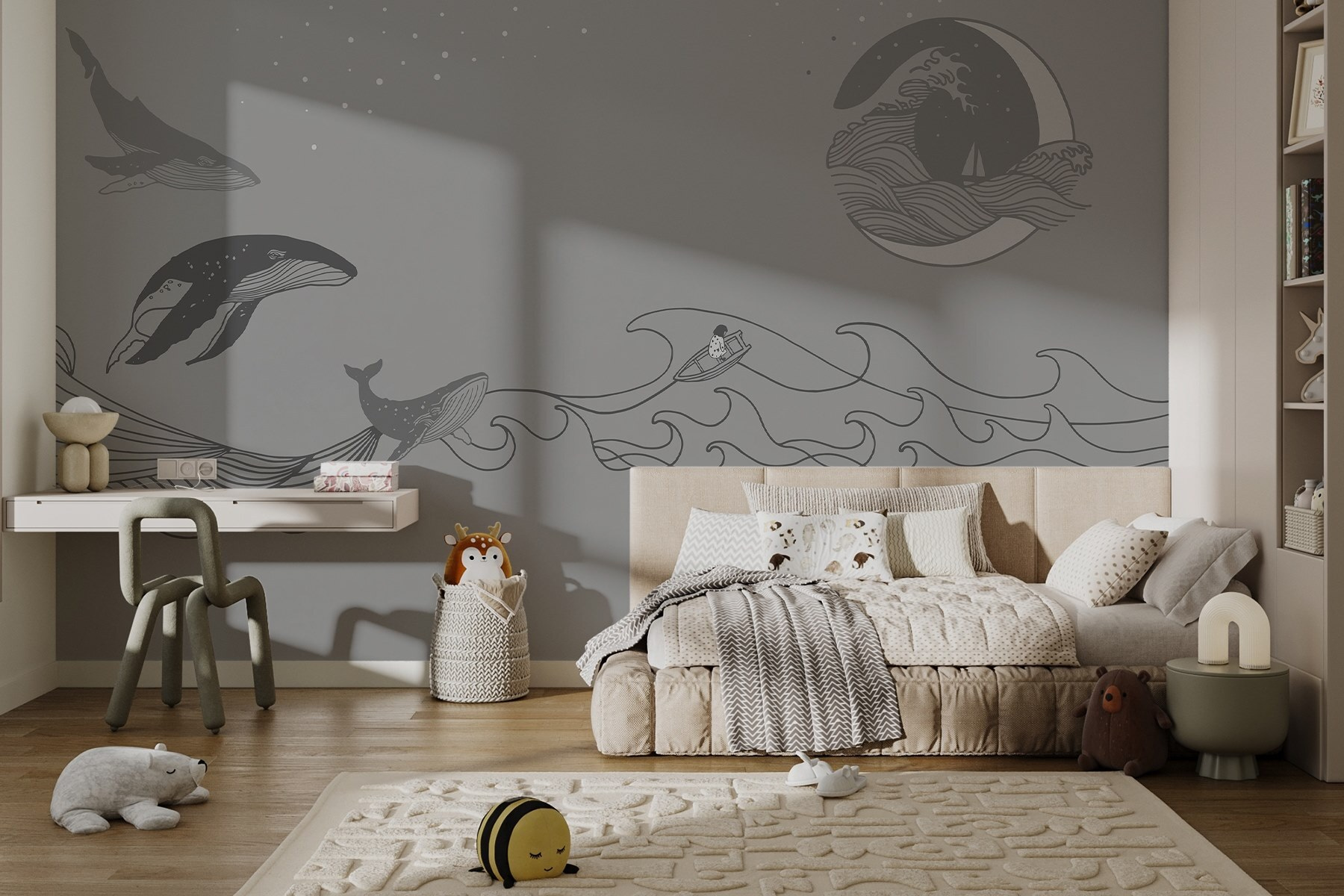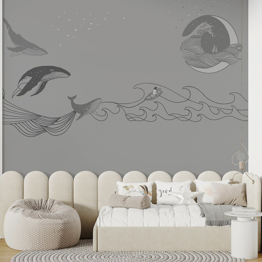 Tauchen Sie ein in eine Welt der Ruhe mit der Wandmalerei “Whale and Man in the Ocean”. Stellen Sie sich das vor: eine heitere Meeresszene, in der verspielte Wale durch die Wellen tanzen und eine abenteuerlustige Seele eine kleine Bootsfahrt unternimmt. Das ist wie ein Tagtraum, den du dir an die Wand hängen kannst!