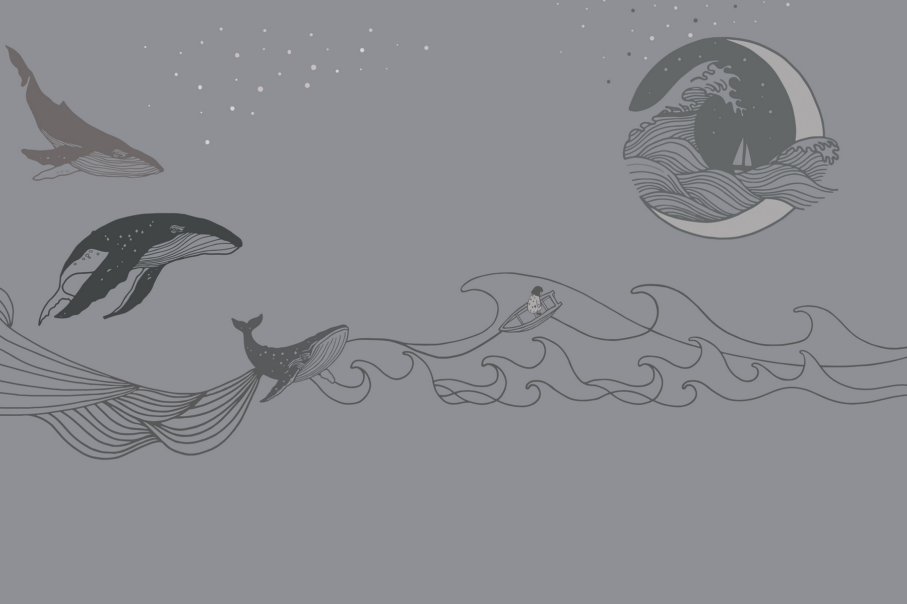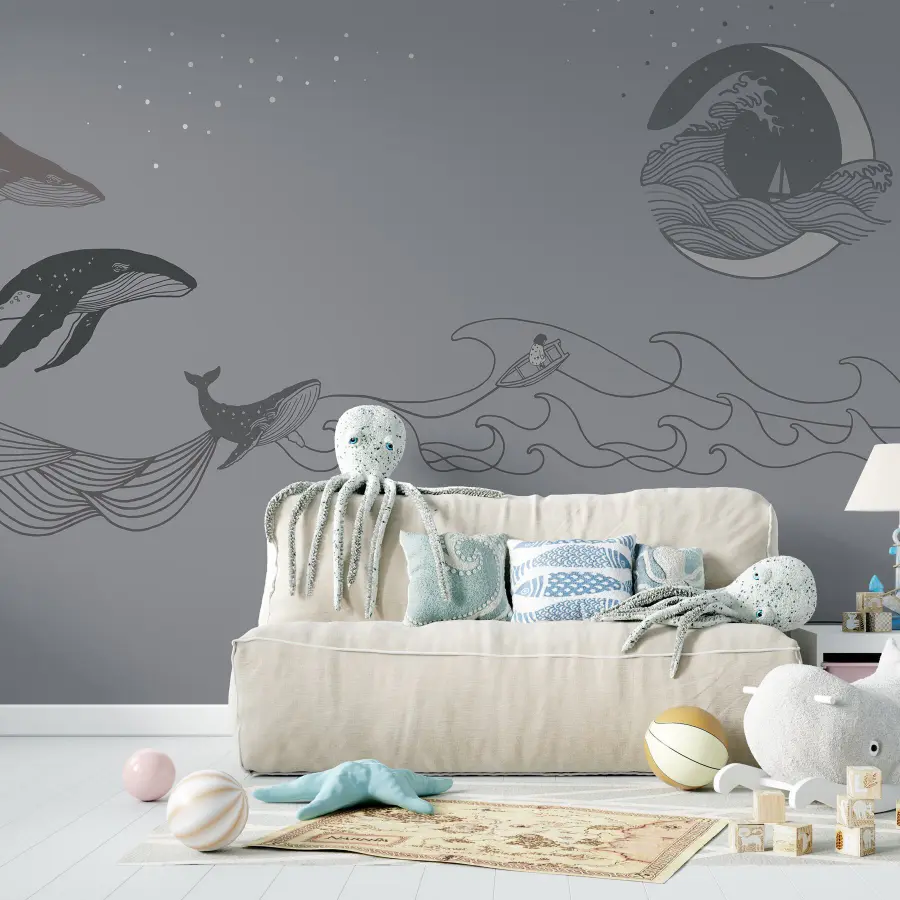Tauchen Sie ein in die heitere Welt des Ozeans mit dieser atemberaubenden Fototapete mit Walen, die anmutig auf einem sanften grauen Hintergrund schweben. Stellen Sie sich vor, Sie betreten Ihren Raum und spüren sofort die beruhigenden Schwingungen – als ob das Flüstern des Ozeans direkt an Ihren Fingerspitzen liegt. Diese Wale, die mit einer solchen Eleganz gezeichnet sind, vermitteln einen abenteuerlichen Geist, der Tagträume über das Meer wecken kann. Stellen Sie sich eine gemütliche Nacht vor, in der Sie vielleicht einen Tee trinken, während die sanften Wellen über Ihre Wand tanzen. Diese Fototapete eignet sich perfekt, um eine ruhige Ecke zu schaffen oder einen Hauch von Meer zu versprühen, ohne dass man in den Badeanzug steigen muss! Es ist nicht nur Dekoration, sondern auch eine Einladung zum Träumen.