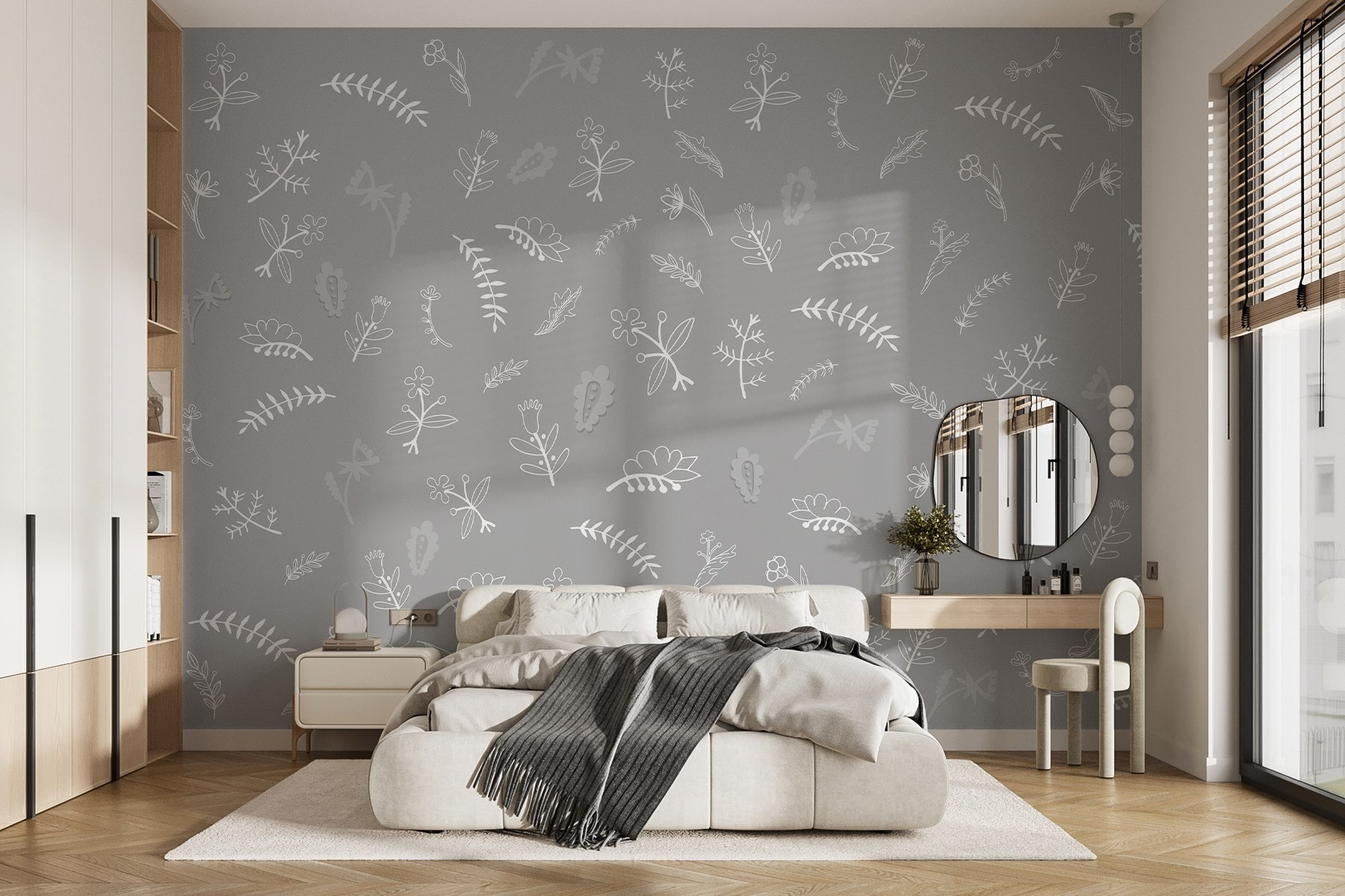 Verwandeln Sie jeden Raum in einen verträumten Rückzugsort mit dieser atemberaubenden Fototapete. Stellen Sie es sich vor: ein weicher grauer Hintergrund, auf dem zarte weiße Blumen und Blätter tanzen, wie das sanfte Flüstern der Natur an Ihren Wänden. Es ist die perfekte Atmosphäre für gemütliche Abende oder lebhafte Versammlungen, bei denen die Gäste einfach stehen bleiben und die Kunstwerke bewundern. Stellen Sie sich vor, Sie trinken einen Kaffee in einem Raum, der von diesem ruhigen Design umgeben ist – es fühlt sich an wie ein kleines Stückchen Gelassenheit zu Hause. Außerdem ist es von Aquarellfarben inspiriert und verleiht dem Raum einen Hauch von Eleganz, ohne sich zu sehr anzustrengen. Bringen Sie etwas Licht herein, legen Sie ein paar bequeme Kissen hinein und lassen Sie das Wandbild auf sich wirken!