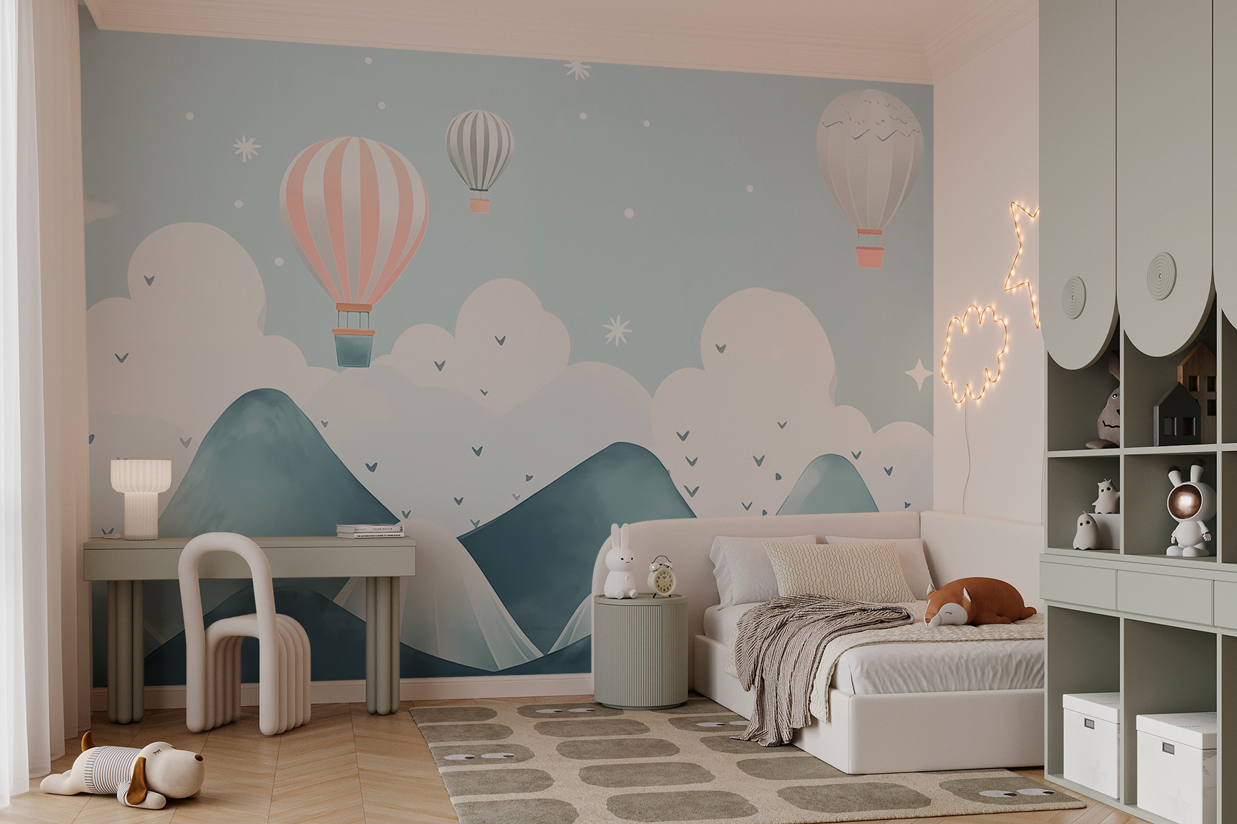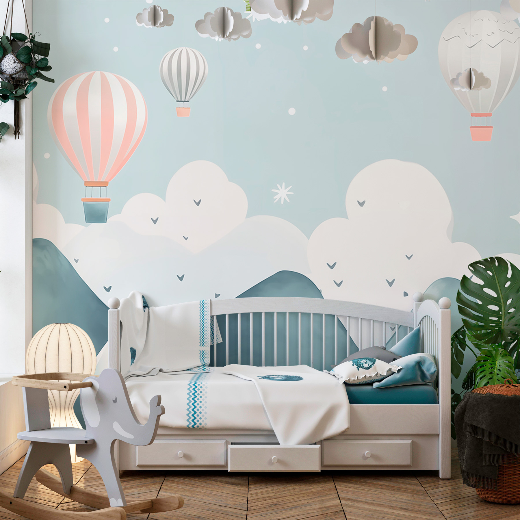 Verschönern Sie Ihren Raum mit dieser bezaubernden Fototapete, die Heißluftballons zeigt, die anmutig über verträumte Berge schweben. Stellen Sie sich vor, Sie wachen jeden Tag mit dieser heiteren Szene auf – es ist, als würden Sie ein Aquarellbild betreten! Die zarten Blautöne und die sanften Farbkleckse vermitteln ein Gefühl der Ruhe und eignen sich perfekt für ein gemütliches Wohnzimmer oder ein ruhiges Schlafzimmer. Stellen Sie sich faule Sonntage mit einer Tasse Kaffee vor, wenn das Tageslicht durchscheint, während Sie davon träumen, zwischen den Wolken zu schweben. Verleihen Sie Ihren Wänden einen Hauch von Skurrilität – vielleicht inspiriert sie Sie zu neuen Abenteuern! Wer weiß, vielleicht wird sogar die Wand anfangen, süße Fluchtpläne zu flüstern.