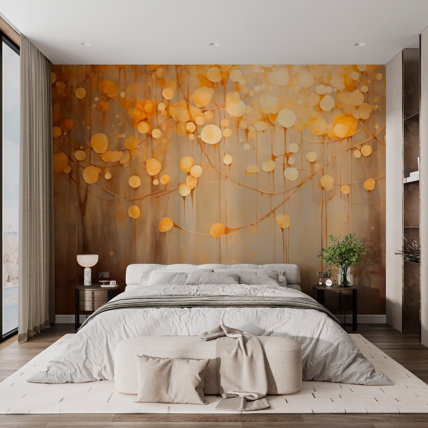 Verwandeln Sie jeden Raum mit der verträumten Fototapete “Dreamy Orbs in an Abstract Haze”. Stellen Sie sich vor, Sie betreten einen gemütlichen Raum, in dem weiche Kugeln sanft über Ihnen schweben und Sie in eine warme Umarmung einhüllen. Dieses Wandbild verleiht einen Hauch von Skurrilität und eignet sich perfekt für eine heitere Flucht aus dem Alltag. Es ist, als würde man in einer Sommernacht Glühwürmchen fangen, nur ohne die Käfer! Die beruhigenden Farben passen wunderbar zueinander und bringen Ruhe in Ihr Zuhause. Ob im Wohnzimmer oder in einer ruhigen Leseecke, dieses Wandbild weckt Freude und einen Hauch von Fantasie. Stellen Sie sich vor, dass Ihre Freunde stehen bleiben, um es zu bewundern – wer würde nicht gerne vor einer so schönen Kulisse plaudern?