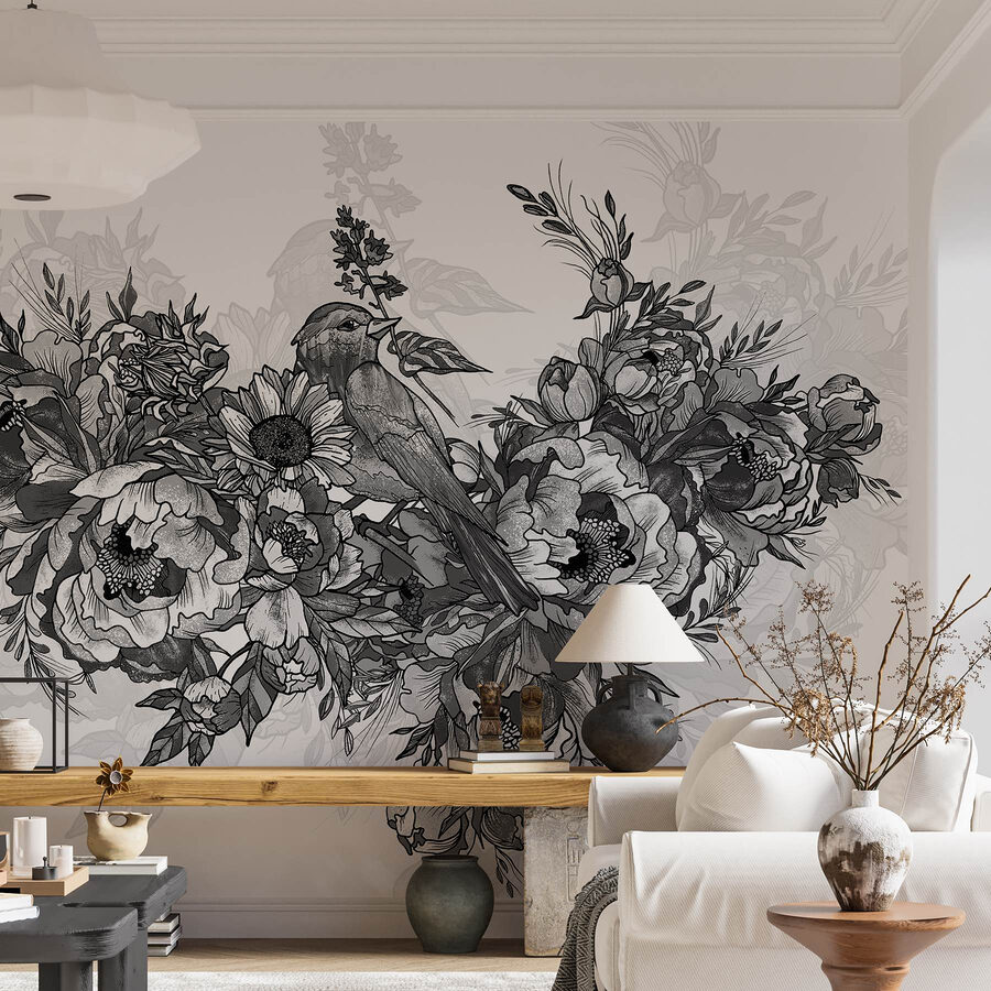 Verwandeln Sie jede Wand in einen verträumten Rückzugsort mit dieser Fototapete, die einen Vogel inmitten leuchtender Blumen zeigt. Es bringt einen Hauch von Natur nach drinnen, perfekt für die Tage, an denen es draußen einfach nicht klappt. Stellen Sie sich vor, Sie machen es sich mit einem Buch gemütlich und haben das Gefühl, dass der Vogel seine Geheimnisse mit Ihnen teilt und Ihnen Geschichten über Frühling und Sonnenschein zuflüstert. Mit Pfingstrosen und Sonnenblumen ist es, als hätte man einen Mini-Garten zu Hause. Ob im Wohnzimmer oder in einer ruhigen Ecke, diese Fototapete sorgt für einen Hauch von Charme und Wärme und verwandelt alltägliche Räume in Ihren persönlichen Rückzugsort. Genau das Richtige, um das Grau zu vertreiben!