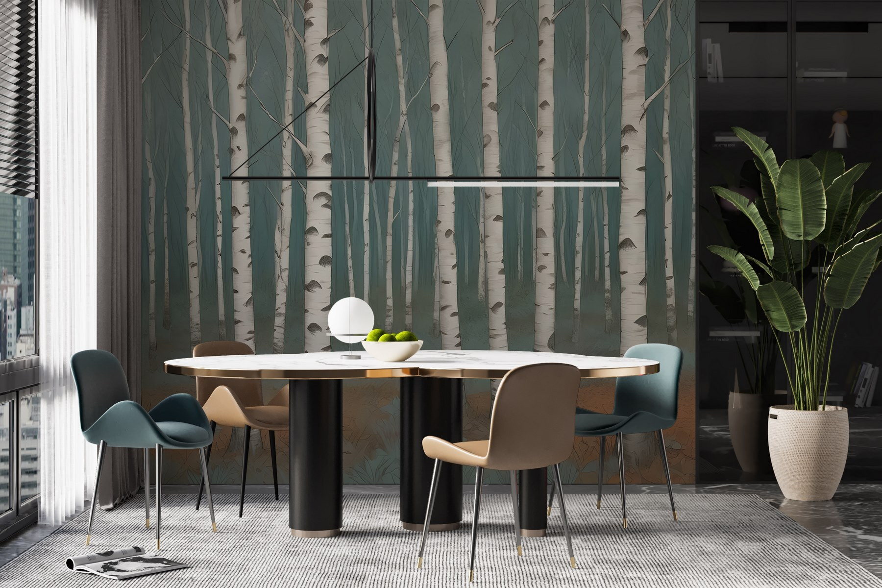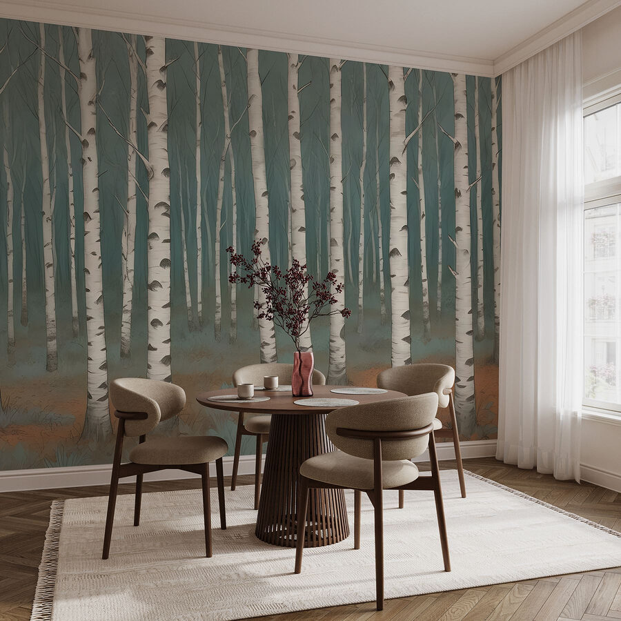Bei jedem Blick auf diese atemberaubende Fototapete tauchen Sie in einen ruhigen Wald ein. Mit einer Gruppe eleganter Birken bringt es die friedliche Atmosphäre der Natur direkt in Ihr Zuhause. Stellen Sie sich vor, Sie machen es sich mit einem guten Buch gemütlich und fühlen sich wie in einem kuscheligen Waldrefugium. Die sanften Farben schaffen eine beruhigende Atmosphäre, die sich perfekt für jeden Raum eignet – vom Wohnzimmer bis zur Meditationsecke.