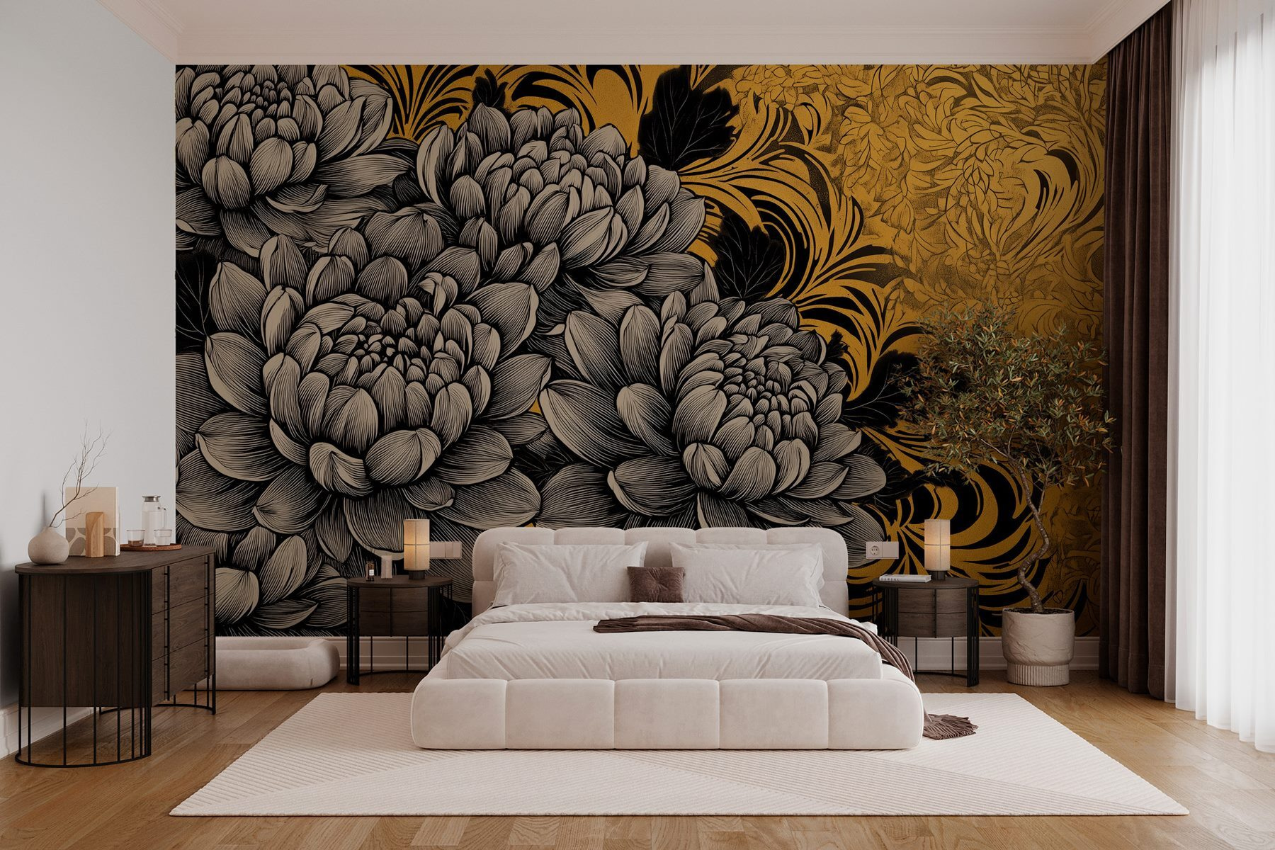 Verwandeln Sie jede trübe Wand in ein blühendes Meisterwerk mit dieser exquisiten floralen Fototapete in Schwarz und Creme. Stellen Sie sich diese wunderschönen Blumen vor, wie sie sich in Ihrem Raum drehen und wenden, fast als würden sie tanzen. Die filigranen Details sorgen für eine elegante Ausstrahlung, die jeden Raum ein wenig lebendiger wirken lässt. Stellen Sie sich vor, Sie wachen auf, schlürfen Ihren Kaffee und werden von dieser atemberaubenden Aussicht begrüßt. Es ist, als würde man in ein botanisches Wunderland eintauchen, nur ohne die Pollen, die einen zum Niesen bringen! Dieses Wandbild eignet sich perfekt für ein Wohnzimmer oder sogar eine gemütliche Ecke und sorgt für Gesprächsstoff. Warum nur dekorieren, wenn man auch gestalten kann?