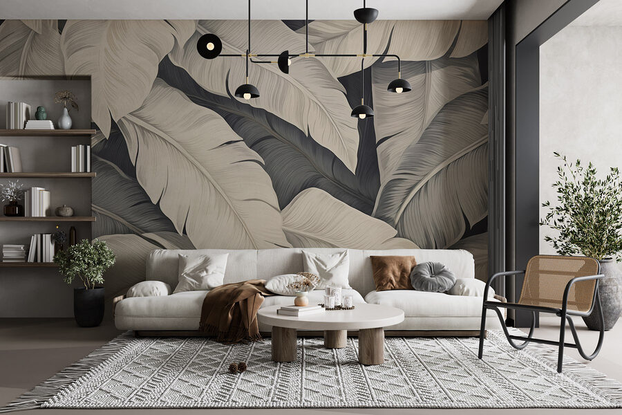 Die Verwandlung eines Raumes kann sich wie Zauberei anfühlen, und genau das bewirkt dieses Wandbild „Nature’s Gentle Palette of Leaves“ (Die sanfte Farbpalette der Blätter der Natur)! Stellen Sie sich vor, Sie betreten einen Raum, der sich wie ein Hauch frischer Luft anfühlt, umhüllt von der beruhigenden Umarmung weicher, eleganter Blätter. Es ist, als würde man einen Indoor-Dschungel betreten – natürlich ohne Insekten.