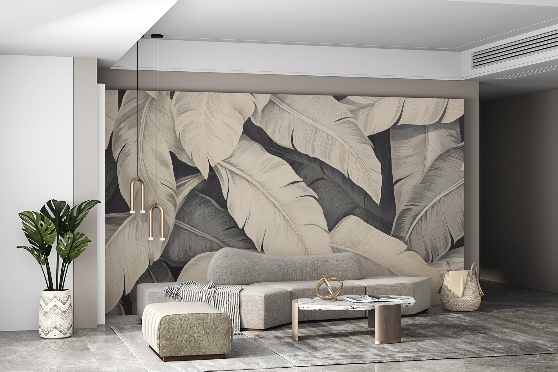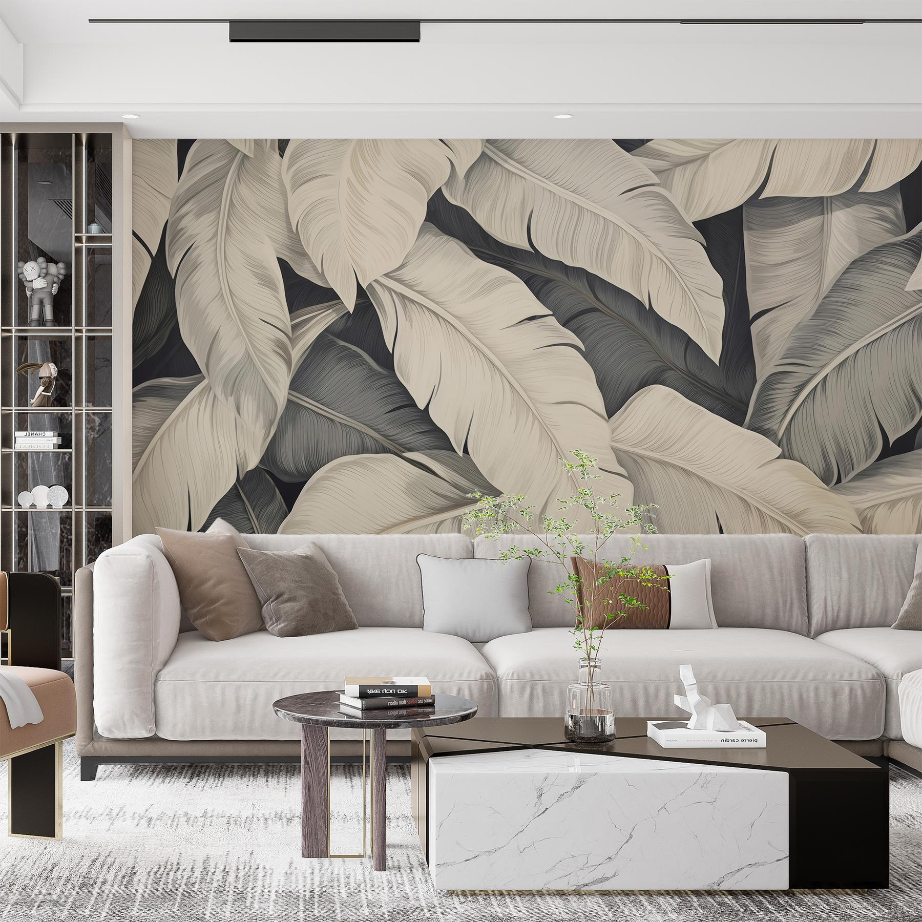 Die Verwandlung eines Raumes kann sich wie Zauberei anfühlen, und genau das bewirkt dieses Wandbild „Nature’s Gentle Palette of Leaves“ (Die sanfte Farbpalette der Blätter der Natur)! Stellen Sie sich vor, Sie betreten einen Raum, der sich wie ein Hauch frischer Luft anfühlt, umhüllt von der beruhigenden Umarmung weicher, eleganter Blätter. Es ist, als würde man einen Indoor-Dschungel betreten – natürlich ohne Insekten.