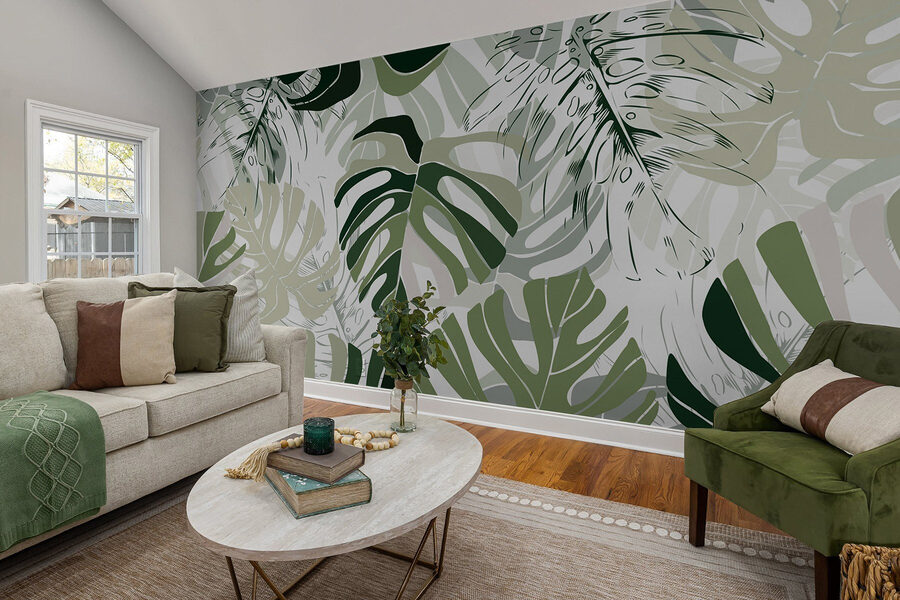 Verwandeln Sie eine schlichte Wand in einen lebendigen Zufluchtsort mit diesem wunderschönen Wandbild mit Blättermuster. Stellen Sie sich vor: Die Sonne scheint durch Ihr Fenster, und diese üppigen grünen Blätter tanzen vor einem strahlend weißen Hintergrund. Es ist wie ein Dschungel im Haus, nur ohne die lästigen Käfer! Dieses Design verleiht jedem Raum eine erfrischende Ausstrahlung – perfekt für eine gemütliche Leseecke oder zur Aufhellung eines tristen Flurs. Stellen Sie sich vor, Sie schlürfen einen Kaffee inmitten dieses fröhlichen Blattwerks und fühlen sich ein bisschen wie auf einem tropischen Ausflug. Es ist einladend, frisch und versprüht den Charme der Natur. Machen Sie sich bereit, Ihrem Raum Leben einzuhauchen!