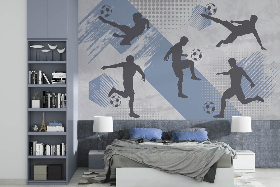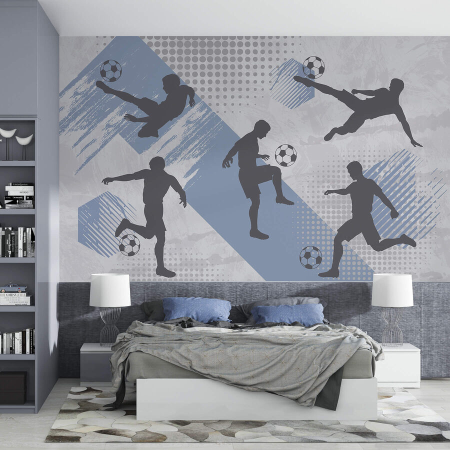Verwandeln Sie eine triste Wand in eine lebendige Szene mit diesem Wandbild, das eine Gruppe von Männern zeigt, die fröhlich Fußball spielen. Es ist perfekt für Fußballfans, die glauben, dass jeder Tag wie ein Spieltag sein sollte – mit spannenden Toren und der unverkennbaren Spannung des Wettbewerbs. Stellen Sie sich vor, Sie betreten einen Raum, in dem Spannung in der Luft liegt, in dem jeder Blick auf die Sportler in Bewegung Sie dazu inspirieren könnte, spontan im Wohnzimmer einen Ball zu kicken. Die lebhaften Blautöne und dynamischen Muster sorgen für eine verspielte Energie und regen zu Gesprächen an. Wer würde sich nicht ein Stück davon für sein Zuhause wünschen? Perfekt für ein Spielzimmer, einen Kinderspielbereich oder sogar eine gemütliche Höhle. Verleihen Sie Ihrem Raum das gewisse Etwas – los geht’s, lassen Sie die gute Stimmung aufkommen!