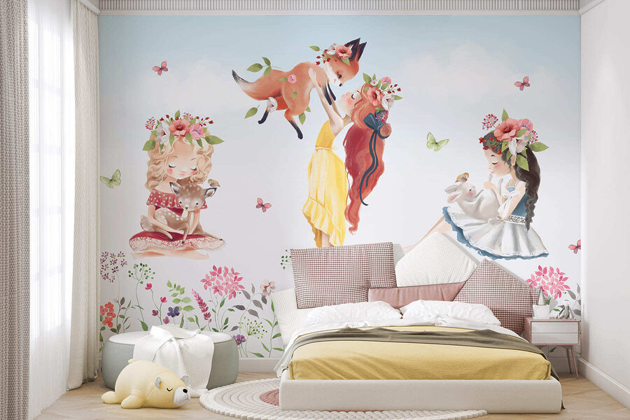 Verwandeln Sie jeden Raum mit dieser bezaubernden Fototapete, die eine charmante Gruppe von Mädchen zusammen mit niedlichen Tieren inmitten eines lebhaften Blumenfeldes zeigt. Stellen Sie sich das entzückende Lachen und die Freudenschreie vor, die es auslöst, und machen Sie es zu einer perfekten Kulisse für spielerische Momente. Jedes Mädchen mit seinem einzigartigen Stil und seinem kuscheligen Begleiter fängt einen skurrilen Geist ein, der sich anfühlt, als würde man in ein Märchenbuch treten. Es ist nicht nur Dekoration, sondern lädt zu Fantasie und Staunen ein. Mit einem Hauch von Magie setzt dieses Wandbild einen schönen Akzent in Kinderzimmern oder Spielbereichen und schafft eine einladende Oase voller Farbe und Wärme. Es ist eine strahlende Erinnerung an unbeschwerte Tage im Freien und wird mit Sicherheit zu herzlichen Gesprächen und schönen Erinnerungen führen.