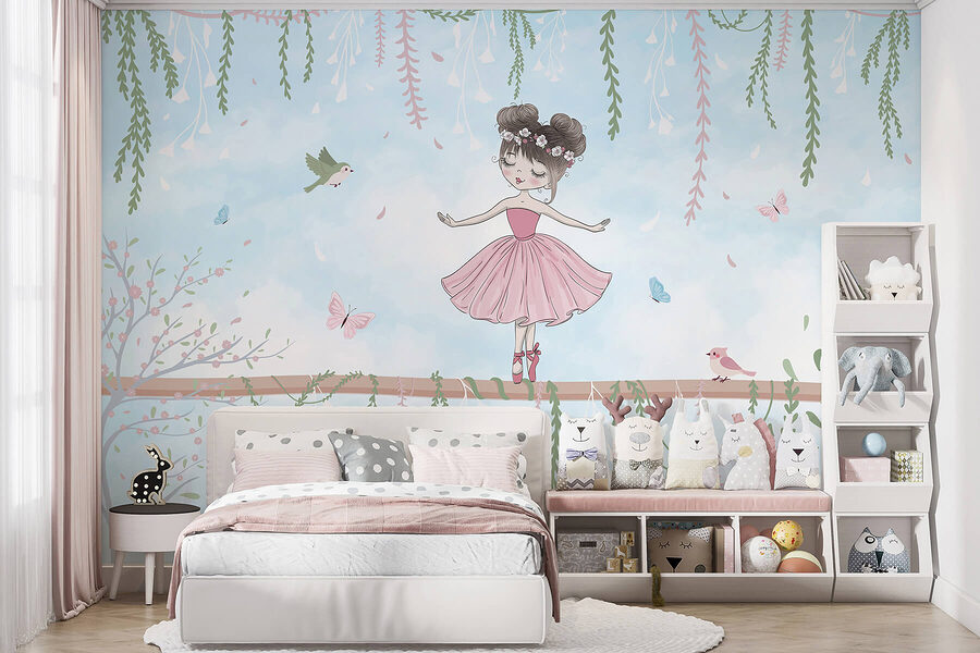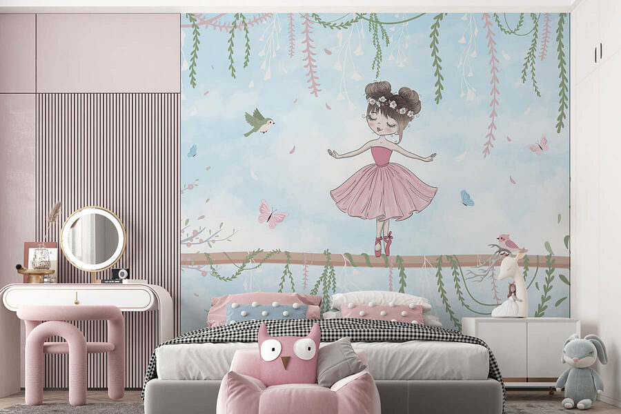 Tauchen Sie ein in eine traumhafte Welt mit dieser bezaubernden Wandtapete, auf der ein charmantes Mädchen in einem rosa Kleid perfekt auf einem Ast balanciert. Umgeben von flatternden Schmetterlingen und verspielten Vögeln wirkt es wie eine Szene aus einem bezaubernden Märchen. Stellen Sie sich vor, wie dieses Bild eine gemütliche Leseecke verschönert oder Freude in das Zimmer eines kleinen Kindes bringt. Die sanften Farben und verspielten Details zaubern ein Lächeln auf die Lippen und lassen jeden Blick wie eine warme Umarmung wirken. Stellen Sie sich vor, Sie trinken Tee, betrachten ihre Anmut und verlieren sich in den Geschichten, die sie inspiriert – mal ehrlich, wer würde das nicht wollen? Dieses Wandbild ist nicht nur Dekoration, es ist eine magische Flucht!