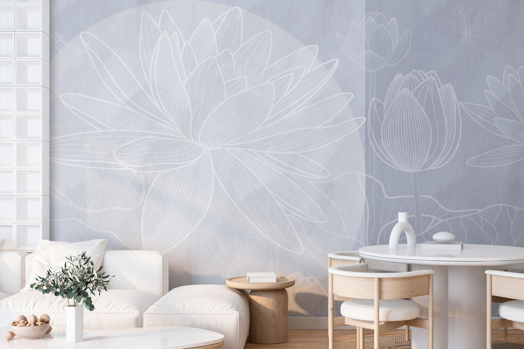 Verwandeln Sie Ihren Raum mit dieser atemberaubenden „Wandtapete mit weißer Blumenzeichnung auf grauem Hintergrund“. Stellen Sie sich vor, Sie betreten Ihr Zimmer und fühlen sich sofort entspannter. Die weichen, fließenden Linien dieser eleganten Blumen sind wie eine sanfte Brise an einem Frühlingstag, die Frieden und Ruhe flüstert.