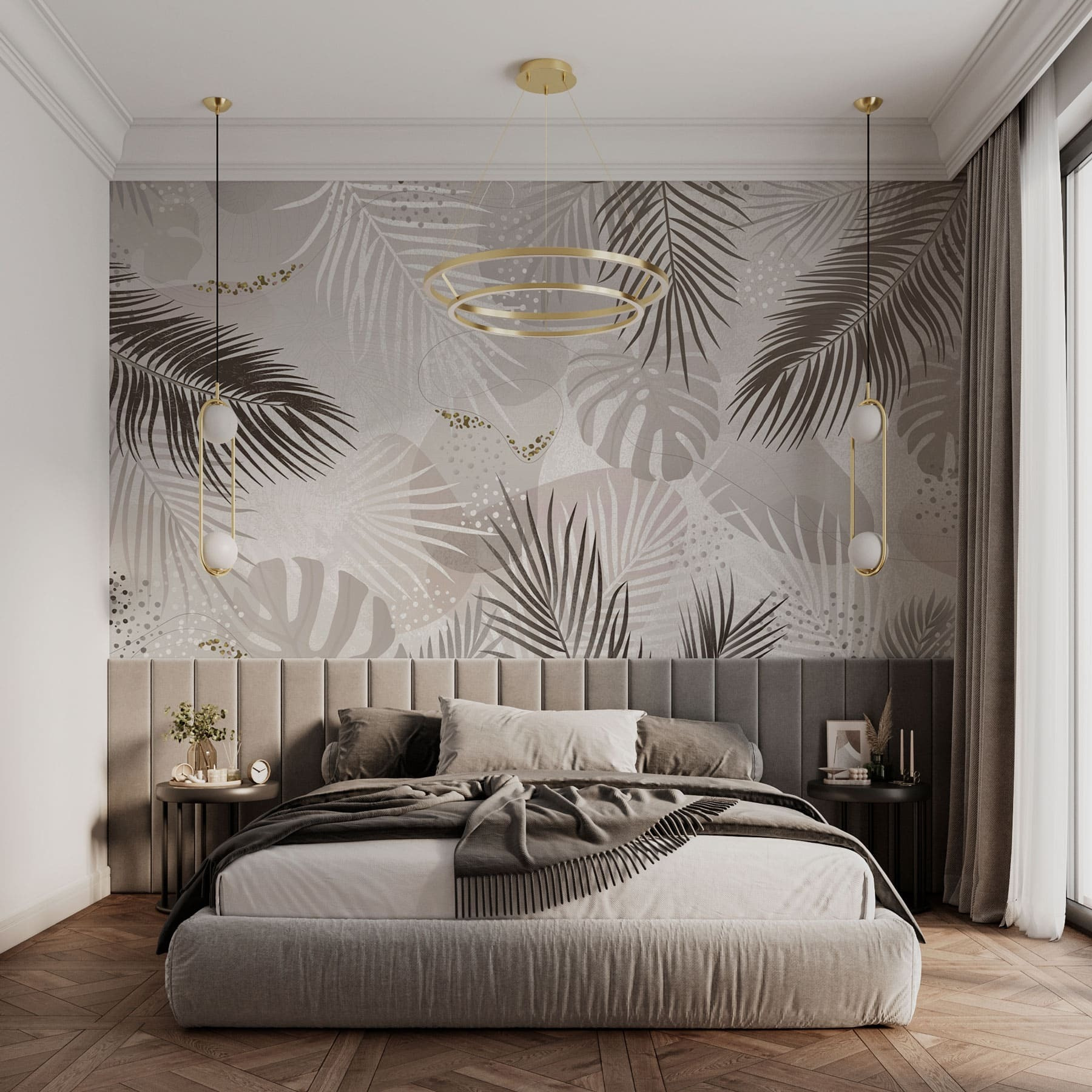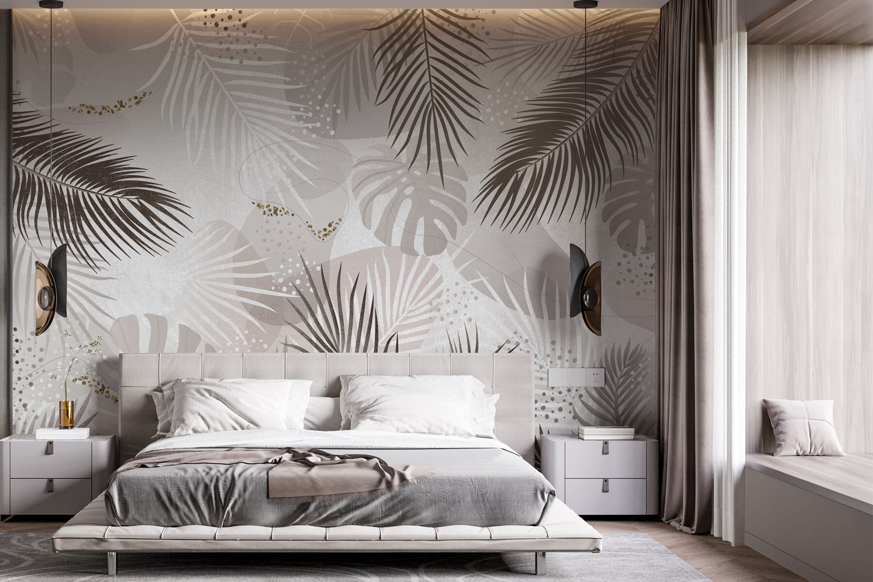 Verwandeln Sie Ihren Raum in eine tropische Oase mit diesem Wandbild, das elegantes Laub in neutralen Tönen zeigt. Stellen Sie sich vor, dass Sie jedes Mal, wenn Sie den Raum betreten, in eine heitere Welt eintauchen, in der sanfte Grüntöne und erdige Brauntöne eine beruhigende Kulisse bilden. Dieses Design sieht nicht nur gut aus, es weckt auch Gefühle der Ruhe in der Natur und erzählt Geschichten von sonnenbeschienenen Dschungeln und luftigen Nachmittagen. Stellen Sie sich vor, wie Sie Freunde mit einem Drink in der Hand empfangen, während sie die üppige Landschaft bewundern und sich vielleicht sogar in ein Gespräch über den letzten Urlaub im Paradies verlieren. Diese Fototapete bringt frischen Wind in jeden Raum und lässt ihn lebendig und mühelos schick erscheinen.