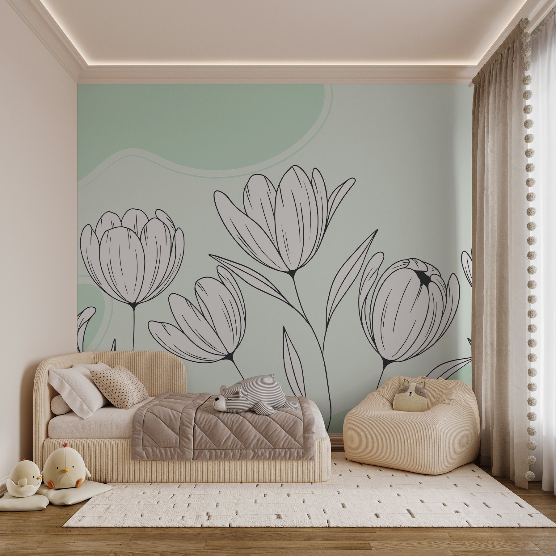 Bringen Sie mit dieser atemberaubenden Wandtapete, die mit einer reizvollen Strichzeichnung von Blumen verziert ist, frischen Wind in Ihren Raum. Sie vereint auf perfekte Weise schlichte Eleganz – stellen Sie sich vor, Sie trinken an einem entspannten Sonntagmorgen Ihren Kaffee, umgeben von diesen Blumen, die niemals welken. Der sanfte grüne Hintergrund vermittelt ein leichtes, luftiges Gefühl und eignet sich somit ideal für jeden Raum, sei es eine gemütliche Leseecke oder eine trendige Büroecke. Es ist eine sanfte Erinnerung an die Schönheit der Natur, ganz ohne Pollen! Außerdem ist es ein toller Gesprächsaufhänger. Wer würde nicht gerne darüber plaudern, wie Kunst sofort für gute Stimmung sorgen kann? Warum also nicht diese Blumen ein wenig Charme und Kreativität an Ihre Wände bringen lassen?