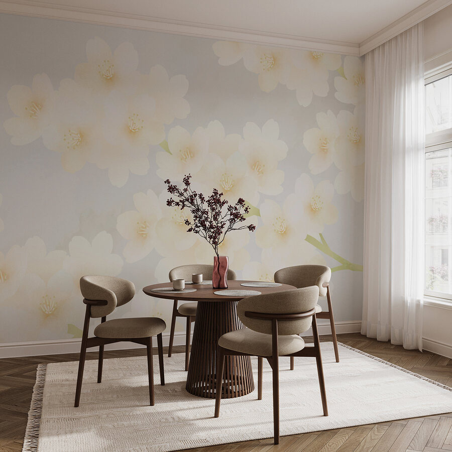 Verschönern Sie jeden Raum mit dieser atemberaubenden Wandtapete, die eine bezaubernde Gruppe weißer Blumen zeigt. Stellen Sie sich vor: Sie betreten einen Raum, der von sanftem Sonnenlicht durchflutet ist, und dort sind sie, diese zarten Blüten – wie eine kleine Einladung der Natur zum Entspannen. Diese Wandtapete hängt nicht nur an der Wand, sie verwandelt die gesamte Atmosphäre und schafft eine Oase der Ruhe direkt bei Ihnen zu Hause. Ihre Freunde werden stehen bleiben und sie bewundern, vielleicht sogar fragen, ob Sie einen geheimen Garten haben. Perfekt für eine gemütliche Ecke oder einen inspirierenden Arbeitsbereich, wirkt sie frisch und doch zeitlos. Lassen Sie Ihre Wände eine Geschichte von Schönheit und Ruhe erzählen!