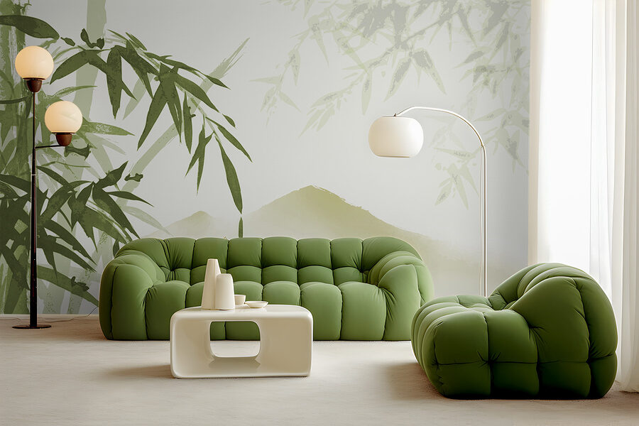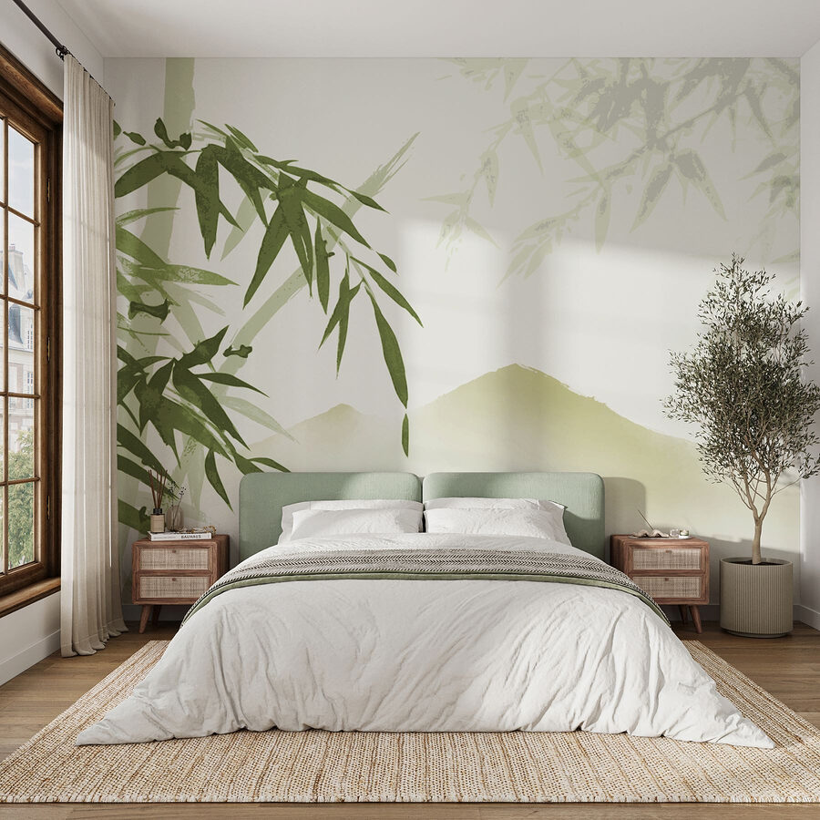 Verwandeln Sie eine schlichte Wand in eine Oase der Ruhe mit der Wandtapete „Beruhigender Bambus und Berglandschaft“. Stellen Sie sich vor, Sie betreten Ihr Zimmer und spüren sofort, wie eine Welle der Ruhe über Sie hinwegspült. Die sanften Grüntöne und die ruhigen Bambusbilder lassen Sie fast das Rascheln der Blätter in einem luftigen Wald hören. Stellen Sie sich vor, Sie trinken Tee, während Sie auf diese Berge blicken – ah, nichts geht über einen Kurzurlaub zu Hause! Es eignet sich perfekt, um eine gemütliche Ecke zu schaffen oder jedem Raum einen Hauch von Natur zu verleihen. Ideal für Momente, in denen Sie einfach innehalten und durchatmen müssen. Warum also nicht ein bisschen Natur hereinlassen?