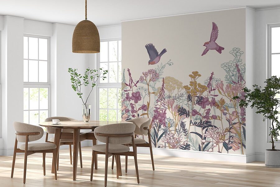 Stellen Sie sich vor, Sie betreten einen ruhigen Garten, in dem bunte Vögel durch duftende Blüten fliegen. Genau das macht dieses Wandbild „Birds Flying Over Flowers“ (Vögel fliegen über Blumen) und verwandelt jeden Raum in einen Ort der Entspannung. Die sanfte Pastellpalette verleiht ihm einen zarten Charme und sorgt für ein Gefühl wie ein Hauch frischer Luft an einem faulen Sonntagmorgen. Stellen Sie sich eine gemütliche Leseecke oder einen lebhaften Essbereich vor, der durch diese bezaubernde Szene belebt wird. Es ist, als hätte man ein Stück Natur direkt an der Wand, das zum Lächeln einlädt und Gespräche anregt. Wer würde sich nicht eine solche Atmosphäre in seinem Zuhause wünschen? Es ist eine kleine Erinnerung an die Schönheit des Alltags. Lassen Sie die Vögel fliegen und lassen Sie Ihre Seele mit ihnen fliegen!