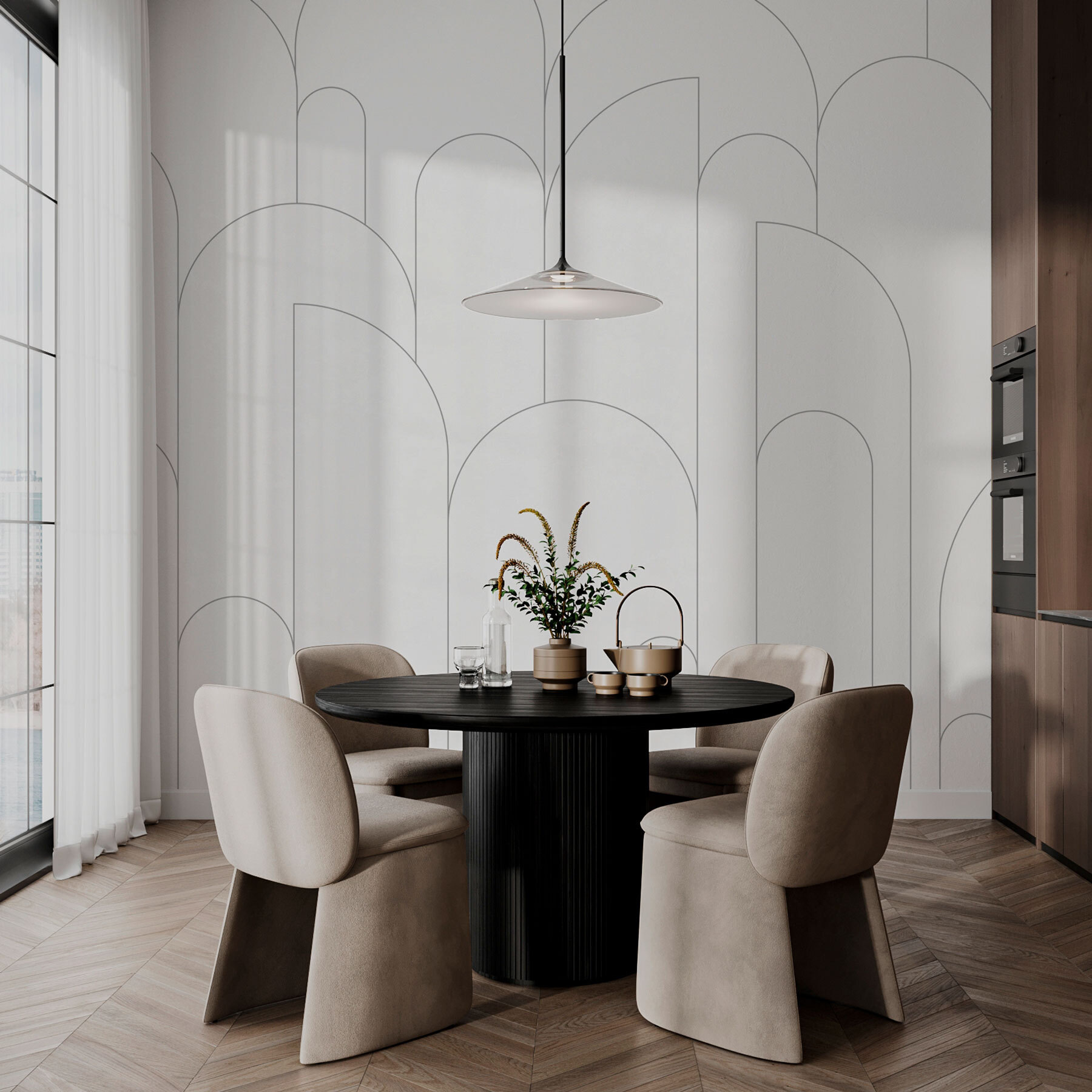 Die verspielten Formen tanzen über die Wand, wecken Neugier und regen zu Gesprächen an, während die minimalistische Farbgebung für Bodenständigkeit sorgt. Ob im Wohnzimmer oder im Homeoffice – sie schafft den Rahmen für Kreativität. Stellen Sie sich vor, Sie empfangen Freunde mit einem Drink in der Hand vor dieser wunderschönen Kulisse. Eine Tapete, die nicht nur dekorativ ist, sondern auch zu Geschichten und Gelächter einlädt – was gibt es daran nicht zu lieben?