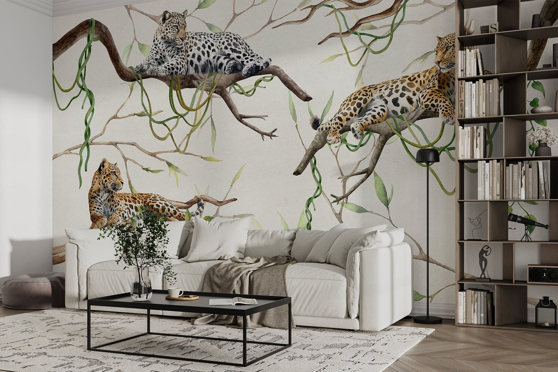 Transform your space into a tropical oasis with this stunning wall mural of leopards lounging on branches. Imagine stepping into the room and feeling the warmth of the jungle, as these majestic big cats seem to watch over you, perfectly relaxed among the vibrant greenery. It’s got that perfect blend of wild and serene, bringing a touch of nature inside without worrying about actual animal antics. Friends might even joke that you’re secretly a wildlife photographer—minus the hiking boots and mosquito bites. So go ahead, let your walls tell a story, wrapping your space in a cozy, exotic escape. Perfect for living rooms or a unique office vibe, this mural’s ready to make any room feel alive with natural beauty.