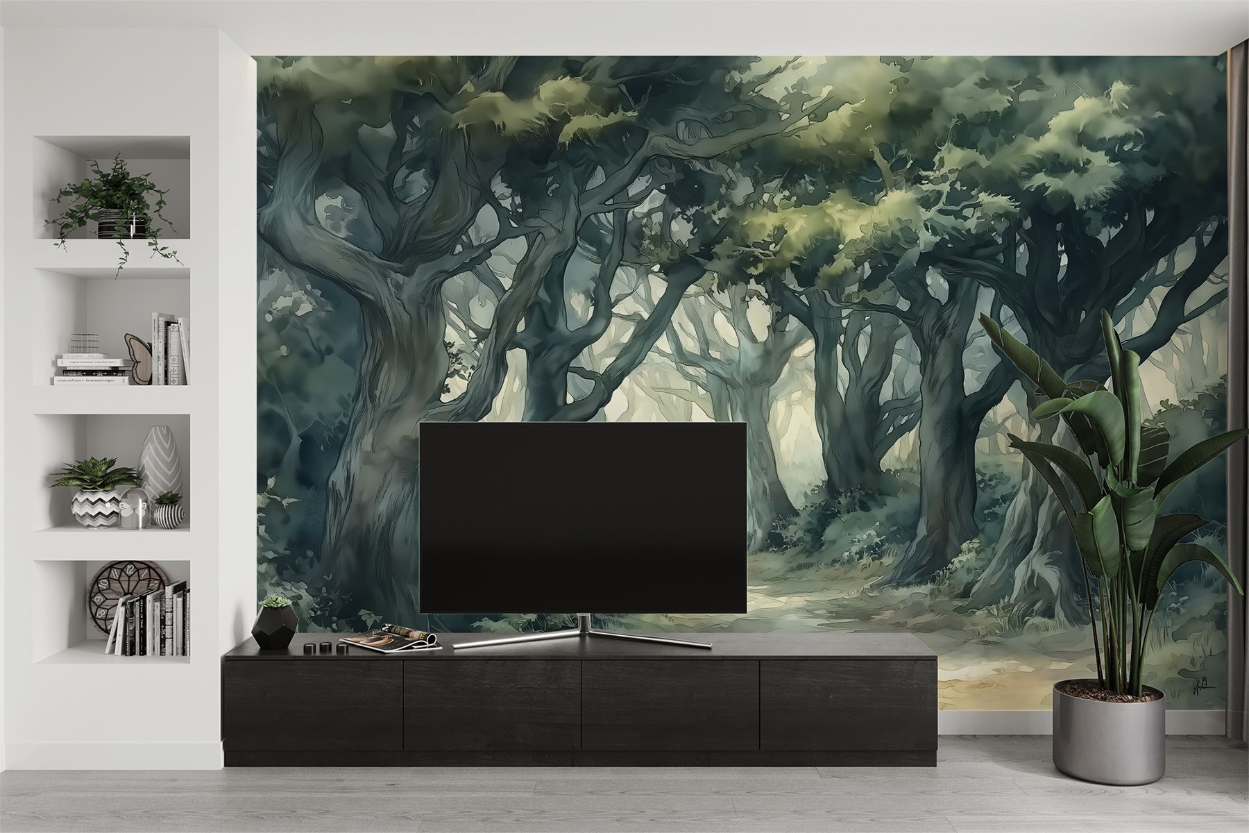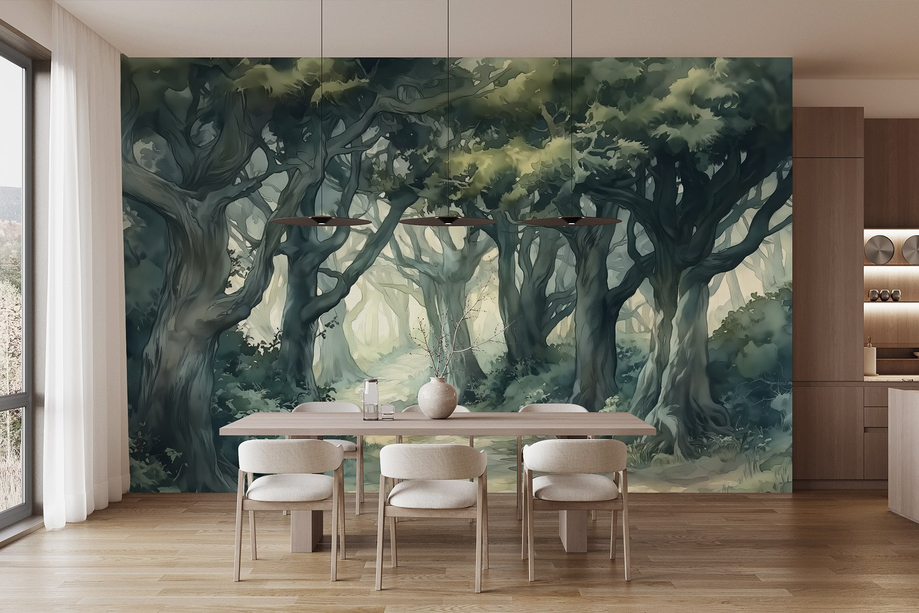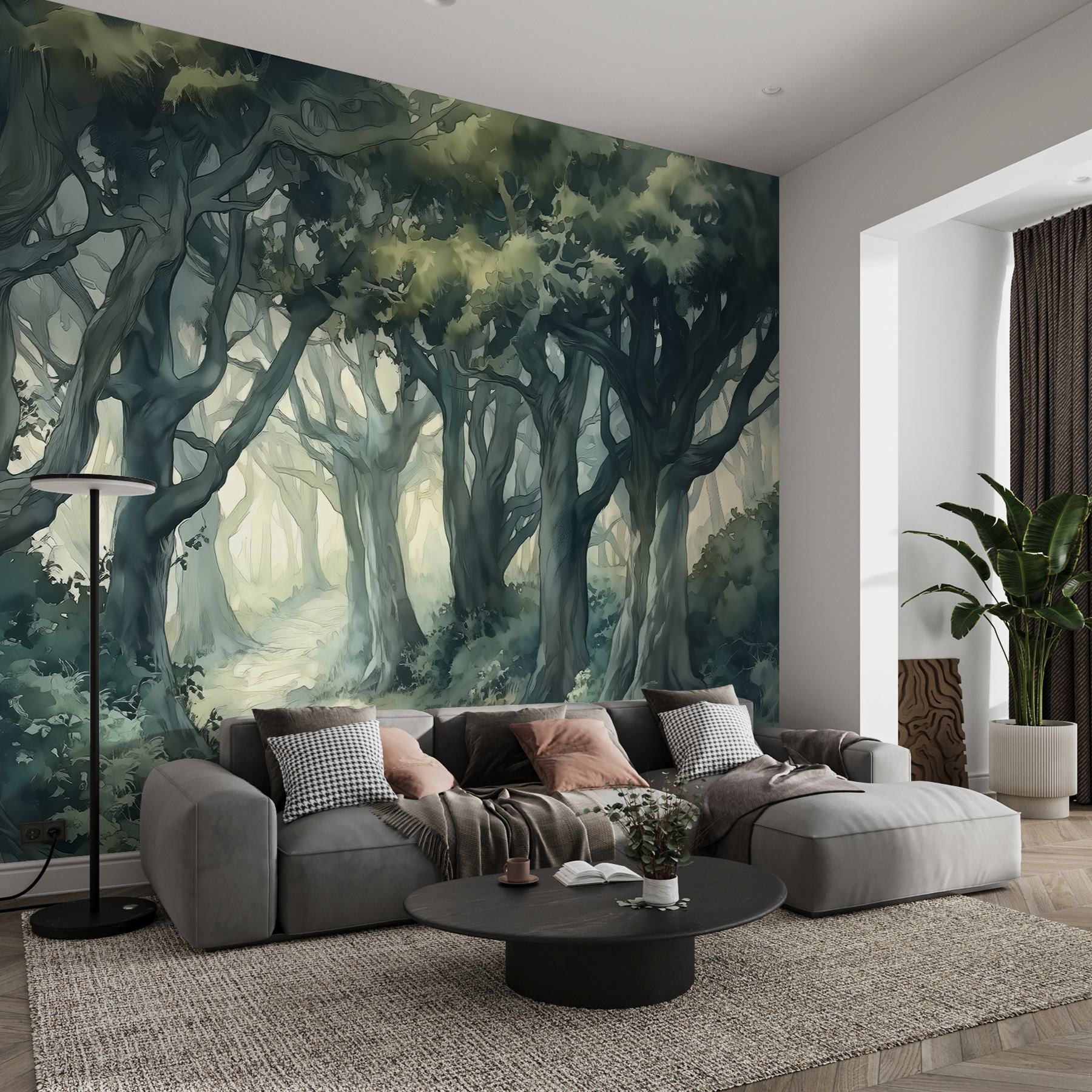 Die sanften Farbtöne und die detaillierten Bäume schaffen eine friedliche Atmosphäre und sind ideal für eine gemütliche Leseecke oder ein ruhiges Schlafzimmer. Stellen Sie sich vor, wie Sie es sich mit einer Tasse Tee gemütlich machen und die beruhigende Szene Sie wie eine warme Umarmung umhüllt. Und wer sagt, dass die Natur nicht nach Hause kommen kann? Mit dieser Fototapete wird das Träumen von Abenteuern im Wald zu einer täglichen Angelegenheit.