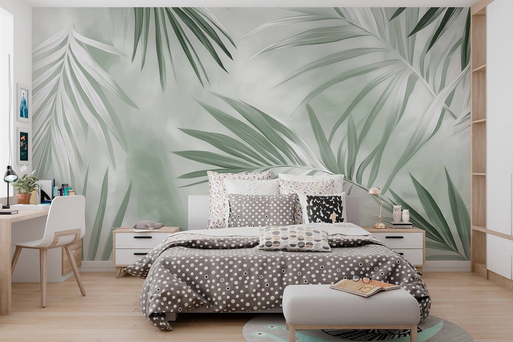 Verwandeln Sie jeden Raum in eine üppige Oase mit dieser Wandtapete „Nature’s Tranquil Green Foliage”. Stellen Sie sich vor, Sie betreten einen ruhigen Dschungel mit sanften Grüntönen, die über Ihre Wände tanzen und Ihnen das Gefühl geben, von Natur umgeben zu sein – selbst wenn Sie nur einen Blick aus dem Fenster auf die Stadt haben! Die sanften Striche der Palmblätter flüstern Entspannung und sind ideal, um eine gemütliche Ecke oder einen ruhigen Hintergrund für Ihre Yogamatte zu schaffen. Denken Sie an entspannte Nachmittage mit einem guten Buch, einer Tasse Tee und dem Duft frischer Erde, der in der Luft liegt. Es ist, als würden Sie ein Stück ruhiges Paradies direkt in Ihr Zuhause holen. Perfekt für alle, die den Beton-Dschungel gegen ein bisschen botanische Glückseligkeit eintauschen möchten. Also, was sagen Sie? Zeit, etwas Schwung in die Sache zu bringen!