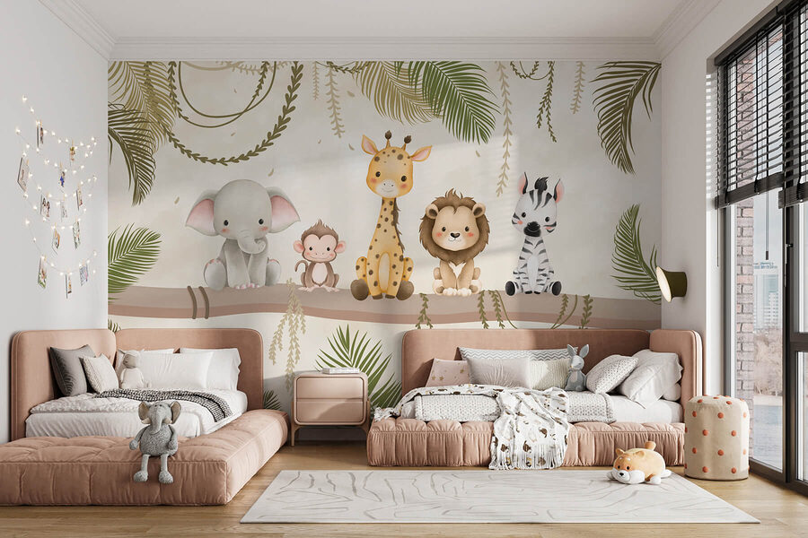 Verwandeln Sie Ihren Raum in einen lebhaften Dschungel mit diesem entzückenden Wandbild, auf dem eine liebenswerte Gruppe von Tierfreunden auf einem stabilen Ast sitzt. Stellen Sie sich das vor: ein frecher Affe, ein sanfter Elefant, eine charmante Giraffe, ein freundlicher Löwe und ein verspieltes Zebra, die alle bereit sind, Freude und Wärme an Ihre Wände zu bringen. Das ist wie eine Mini-Safari direkt bei Ihnen zu Hause. Dieses Wandbild eignet sich perfekt für ein Spielzimmer oder eine gemütliche Ecke, es lädt zum Lächeln ein und regt die Fantasie an. Wer würde nicht gerne nach Hause kommen und einen Haufen freundlicher Gesichter vorfinden? Perfekt für Kinder jeden Alters oder einfach für jeden, der ein großes Herz für Tiere hat!