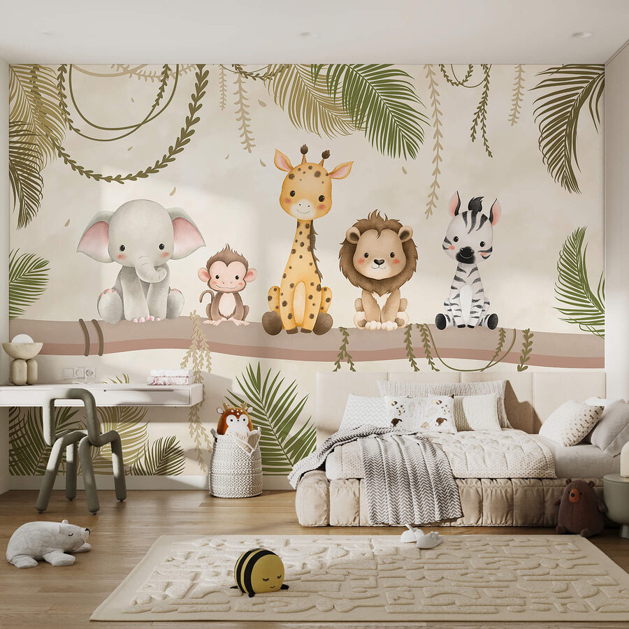 Verwandeln Sie Ihren Raum in einen lebhaften Dschungel mit diesem entzückenden Wandbild, auf dem eine liebenswerte Gruppe von Tierfreunden auf einem stabilen Ast sitzt. Stellen Sie sich das vor: ein frecher Affe, ein sanfter Elefant, eine charmante Giraffe, ein freundlicher Löwe und ein verspieltes Zebra, die alle bereit sind, Freude und Wärme an Ihre Wände zu bringen. Das ist wie eine Mini-Safari direkt bei Ihnen zu Hause. Dieses Wandbild eignet sich perfekt für ein Spielzimmer oder eine gemütliche Ecke, es lädt zum Lächeln ein und regt die Fantasie an. Wer würde nicht gerne nach Hause kommen und einen Haufen freundlicher Gesichter vorfinden? Perfekt für Kinder jeden Alters oder einfach für jeden, der ein großes Herz für Tiere hat!