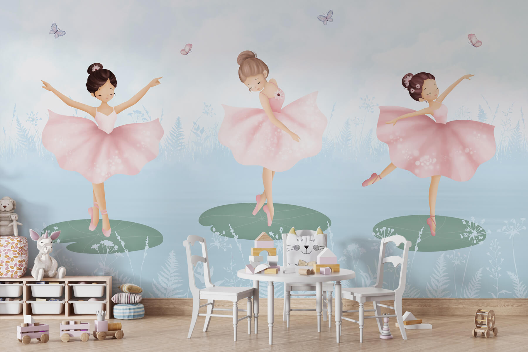 Verwandeln Sie das Kinderzimmer in ein magisches Wunderland mit dieser skurrilen Fototapete, auf der ein Trio charmanter Mädchen in rosa Tutus auf Seerosenblättern tanzt. Stellen Sie sich das Kichern der Kleinen vor, wenn sie die umherflatternden Schmetterlinge entdecken, die ihre Spielzeit mit einem Hauch von Magie bereichern. Es ist, als ob man sich ein Märchen ins Haus holt. Dieses Wandbild eignet sich perfekt, um die Fantasie während der Märchenstunde anzuregen oder einfach nur eine gemütliche Ecke zu verschönern, denn es verbreitet eine verspielte Stimmung, die jeden zum Lächeln bringt. Stellen Sie es sich einfach vor – tanzende Schuhe, Lachen und ein Hauch von Freude in jedem Blick.