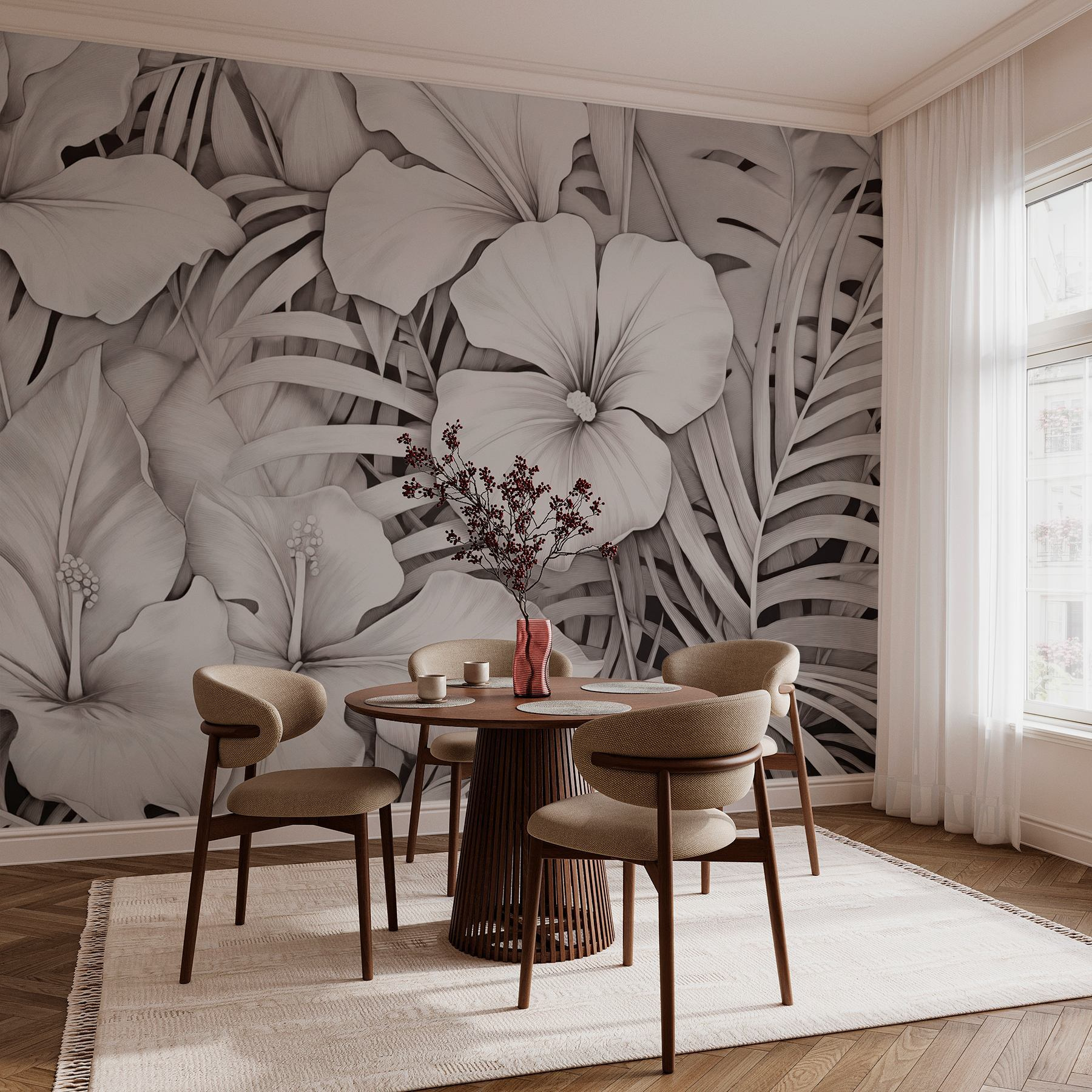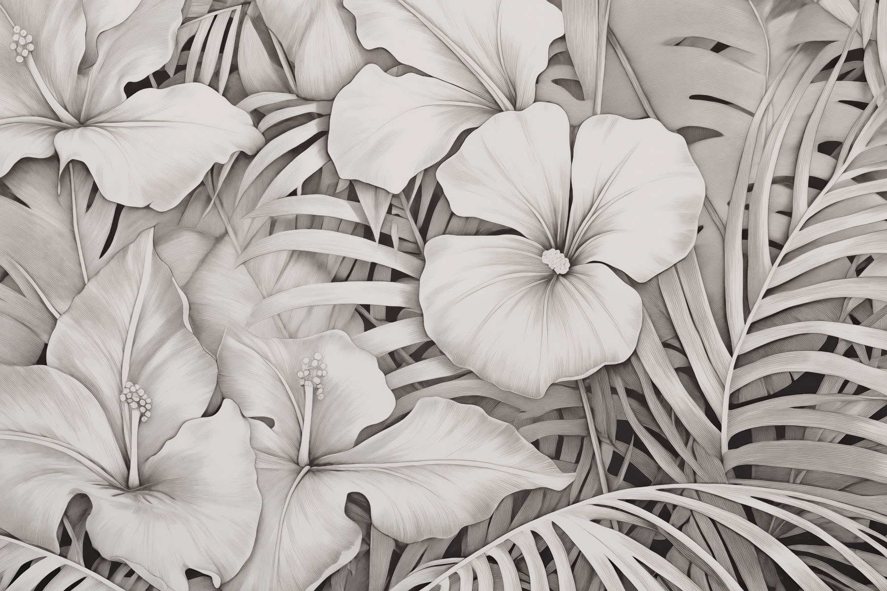 Verwandeln Sie jeden Raum mit dieser atemberaubenden Wandtapete, die ein elegantes Blumenmuster in beruhigenden monochromen Farbtönen zeigt. Stellen Sie sich vor, Sie betreten Ihren Raum und werden von üppigen Blättern und Blumen begrüßt – es ist, als hätten Sie einen kleinen tropischen Urlaub direkt zu Hause. Diese Wandtapete ist perfekt, um eine ruhige Atmosphäre zu schaffen, und verbindet mühelos die Schönheit der Natur mit modernem Stil.