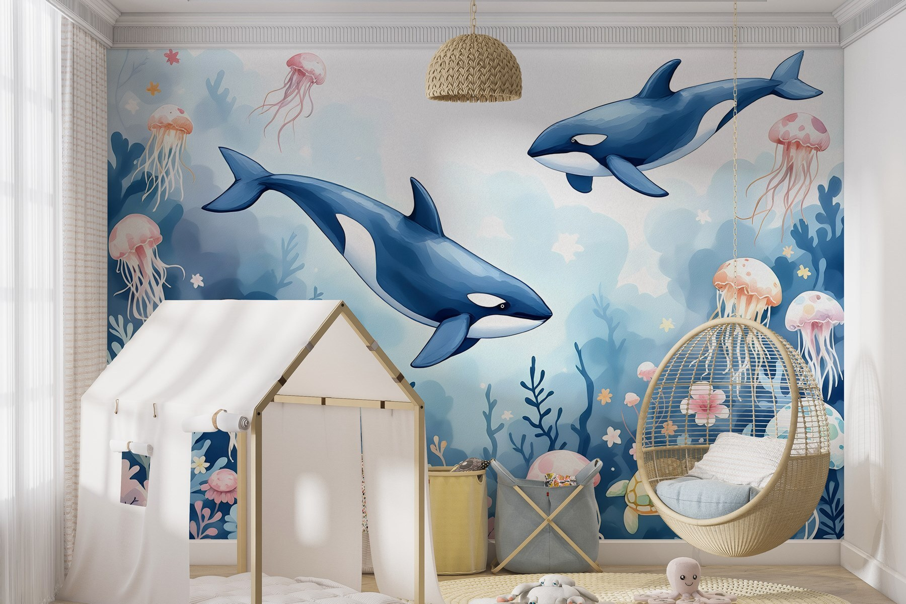 Transform your space into an underwater wonderland with this enchanting wall mural featuring whales and a playful turtle frolicking through vibrant ocean waters. Imagine stepping into a room where jellyfish drift lazily, and colorful corals sway like they’re dancing. It’s like having your own slice of the sea right at home! Perfect for coastal vibes, this mural will have you daydreaming of beach days and ocean breezes. Who wouldn’t smile seeing turtles go about their business in a sea of serenity? This artwork is not just decor; it’s an invitation to escape and explore—no scuba gear required!