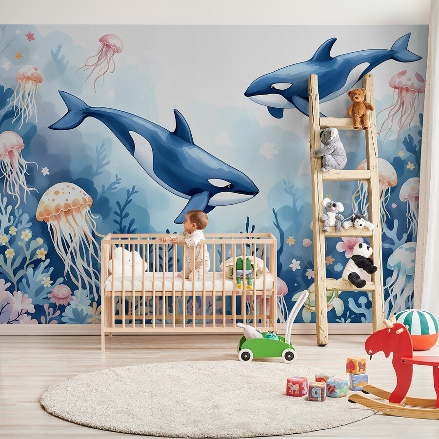 Verwandeln Sie Ihren Raum in ein Unterwasser-Wunderland mit dieser bezaubernden Wandtapete, auf der Wale und eine verspielte Schildkröte durch das lebhafte Meerwasser tummeln. Stellen Sie sich vor, Sie betreten einen Raum, in dem Quallen träge dahintreiben und bunte Korallen wie tanzend hin und her schwanken. Es ist, als hätten Sie ein Stück Meer direkt bei sich zu Hause! Diese Tapete ist perfekt für Küstenflair und lässt Sie von Strandtagen und Meeresbrisen träumen. Wer würde nicht lächeln, wenn er Schildkröten in einem Meer der Ruhe bei ihren Aktivitäten beobachtet? Dieses Kunstwerk ist nicht nur Dekoration, sondern eine Einladung zum Entfliehen und Entdecken – ganz ohne Tauchausrüstung!