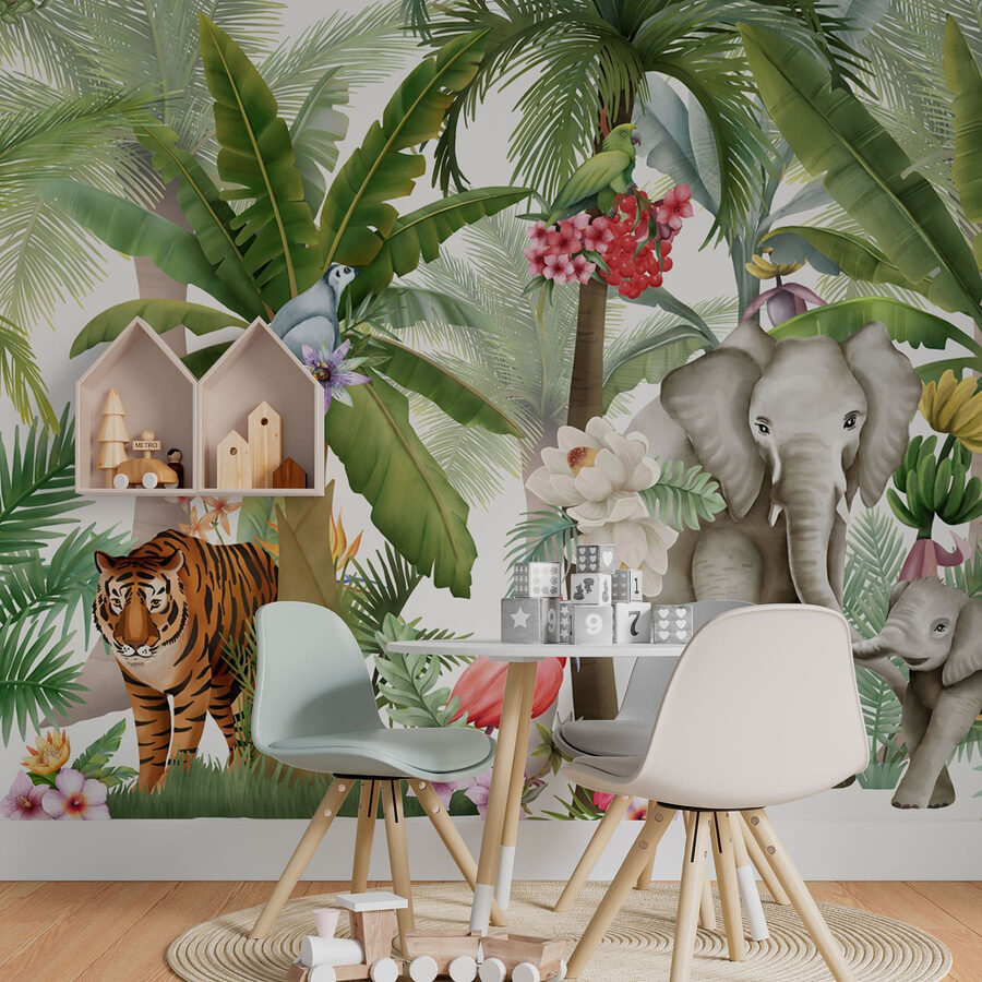 Verwandeln Sie Ihren Raum mit diesem lebendigen Dschungel-Wandbild, auf dem verspielte Affen herumschwingen und majestätische Elefanten umherstreifen. Es ist, als würde man direkt in einen lebhaften Regenwald eintreten, nur ohne die Mückenstiche! Das üppige Grün und die bunten Vögel schaffen eine Kulisse, die sowohl beruhigend als auch belebend wirkt. Stellen Sie sich vor, Sie trinken Ihren Morgenkaffee, während Sie die warme Sonne und die sanfte Brise spüren – oh, Moment, das ist ja nur Ihr gemütliches Wohnzimmer! Diese Wandtapete ist perfekt für Tierliebhaber, denn sie bringt die Wildnis ins Haus, sorgt für Freude und lässt jeden Moment wie ein Abenteuer erscheinen. Genießen Sie das ganze Jahr über tropisches Flair!