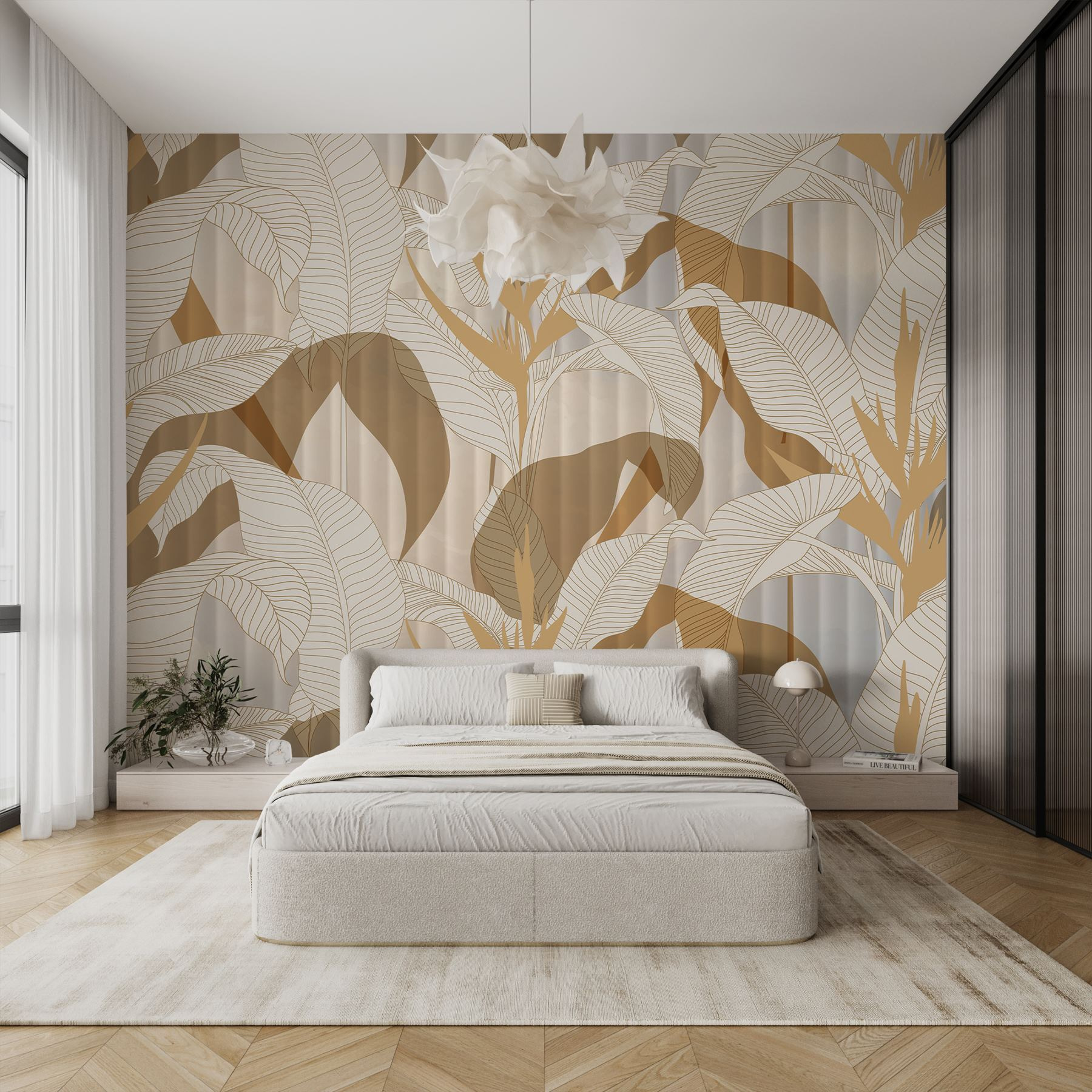Verwandeln Sie jeden Raum in eine ruhige Oase mit dieser atemberaubenden Fototapete mit üppigen Blättern und leuchtenden Blumen. Es ist, als ob man sich ein Stück Natur ins Haus holt, ohne dass man es gießen muss! Die erdigen Töne passen wunderbar zu einer Reihe von Einrichtungsstilen und machen es perfekt für gemütliche Ecken oder sogar ein lebhaftes Wohnzimmer. Stellen Sie sich vor, Sie wachen jeden Morgen mit diesem Anblick auf. Das lässt den Tag gleich ein bisschen heller erscheinen, oder? Und die Gäste werden sich fragen, woher das tropische Paradies kommt. Schon ein wenig Grün kann eine Wand in einen Gesprächsanlass verwandeln!