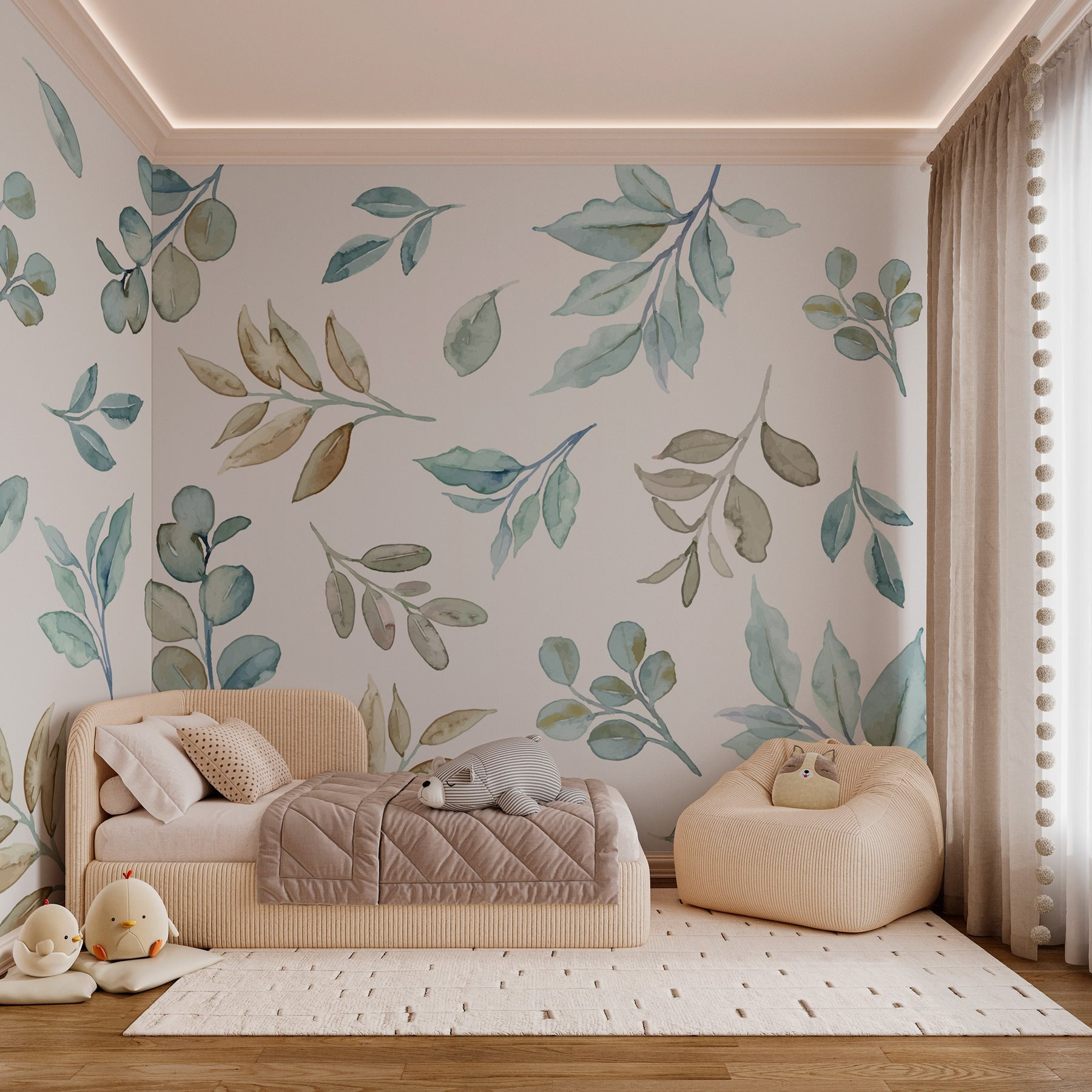 Verwandeln Sie jeden Raum in einen ruhigen Rückzugsort mit dieser atemberaubenden Fototapete, die ein lebendiges Muster aus Blättern und Zweigen zeigt. Stellen Sie sich vor, dass Sie jedes Mal, wenn Sie den Raum betreten, einen sonnigen Wald betreten – wie erfrischend wäre das? Das Aquarelldesign mit seinen sanften Grüntönen und weichen Erdtönen bringt einen Hauch von Natur ins Haus – perfekt für alle, die sich in ihrem hektischen Leben nach etwas Ruhe sehnen.