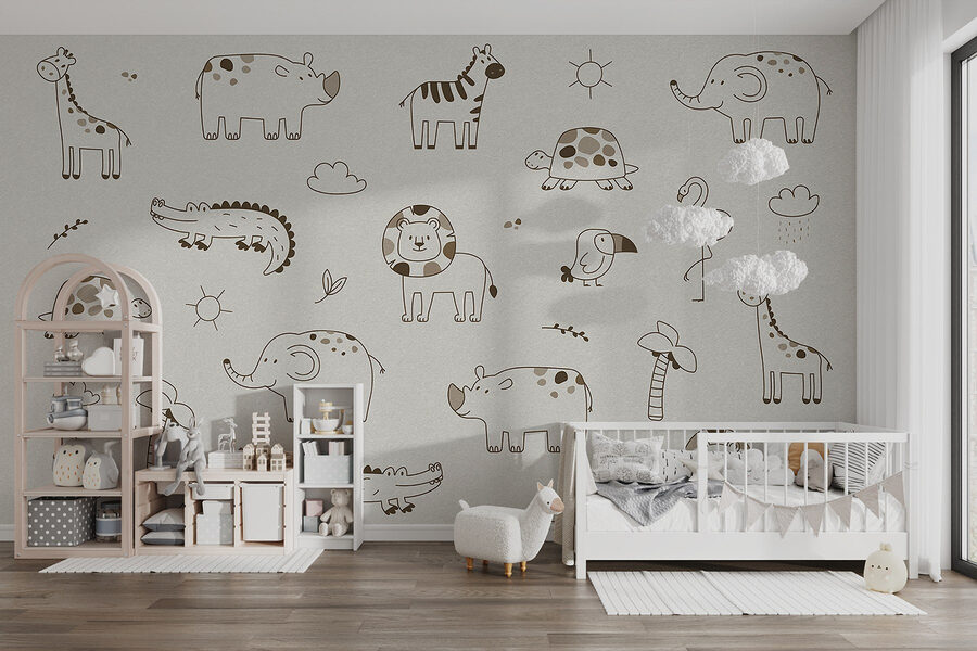 Verwandeln Sie jeden Raum in eine bezaubernde Safari mit diesem verspielten Wandbild, das eine skurrile Gruppe von Tieren zeigt. Stellen Sie sich eine Giraffe, einen Elefanten und sogar eine kleine Schildkröte vor, die auf einem sauberen weißen Hintergrund faulenzen – es ist wie eine Wildlife-Party, zu der jeder eingeladen ist. Diese Fototapete versprüht eine fröhliche Stimmung, die das Kinderzimmer zum Strahlen bringt oder eine gemütliche Ecke aufpeppt. Stellen Sie sich das Lächeln vor, das es hervorrufen wird, das Geschichten und Abenteuer auslöst. Es ist nicht nur Dekoration, sondern eine tägliche Erinnerung daran, dass das Leben spielerisch und phantasievoll sein kann. Perfekt für jeden, der einen Raum mit ein wenig Humor und Herz aufpeppen möchte!