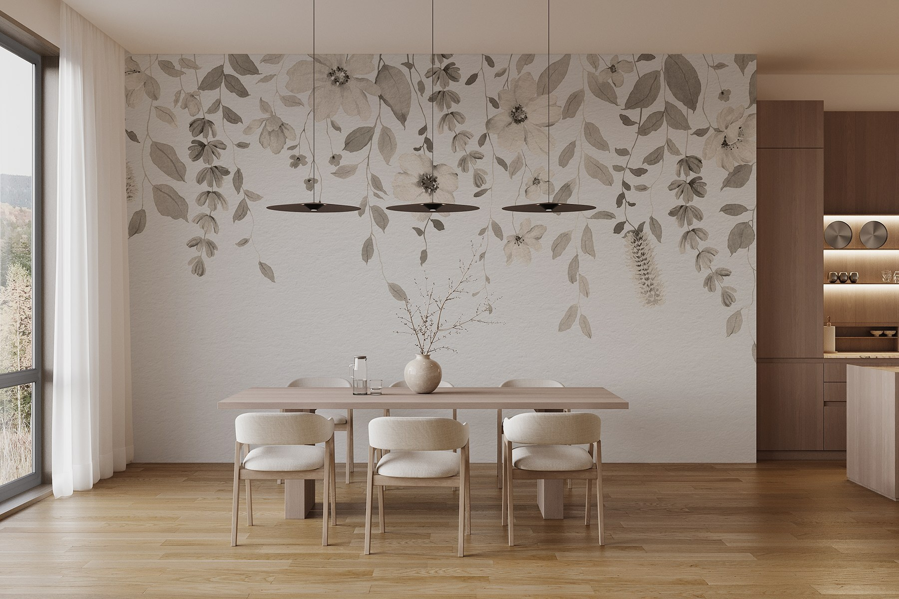 Stellen Sie sich vor, Sie betreten einen Raum, der sich wie ein ruhiger Garten anfühlt, in dem sanfte Blumentöne Ihre Sinne umhüllen. Dieses Wandbild mit seinen sanften Aquarellstrichen schafft eine beruhigende Atmosphäre, die sich wie eine warme Umarmung nach einem langen Tag anfühlt. Jedes Blütenblatt und jedes Blatt tanzt anmutig und lädt einen Hauch von frischer Luft in jeden Raum ein. Es eignet sich perfekt für eine gemütliche Leseecke oder ein verträumtes Schlafzimmer – stellen Sie sich vor, Sie machen es sich mit einem Buch gemütlich, umgeben von solcher Schönheit. Dieses Wandbild vermittelt Ruhe und einen Hauch von Natur und verwandelt eine gewöhnliche Wand in einen schönen Rückzugsort.