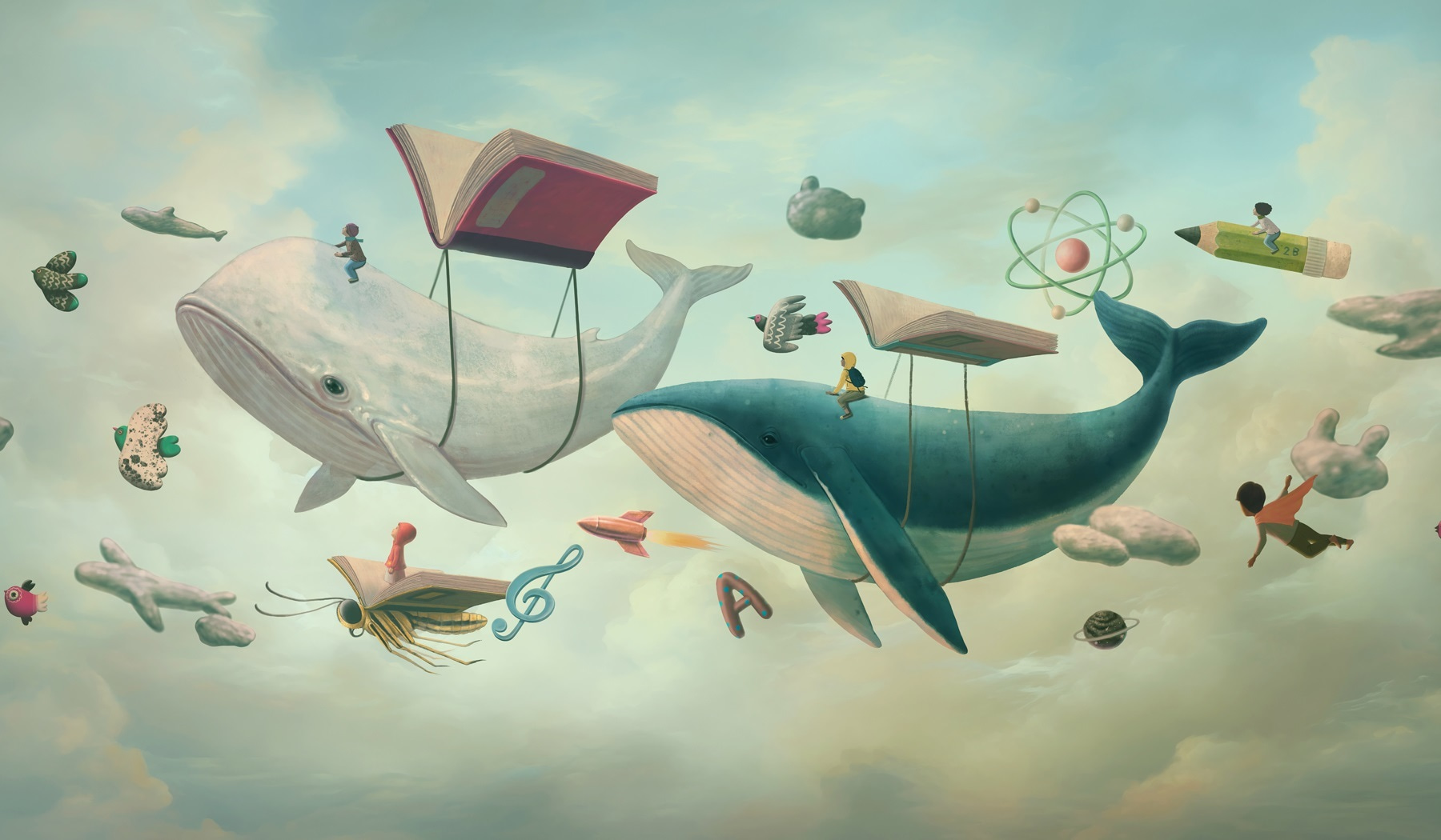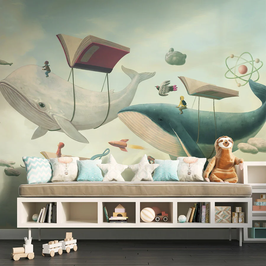 Verwandeln Sie Ihren Raum mit dem skurrilen Charme dieser Fototapete, auf der skurrile Wale durch einen verträumten Himmel schweben. Diese sanften Riesen, die mit Büchern schwimmen, laden die Fantasie und das Abenteuer in jeden Raum ein. Es ist, als würde man in eine Geschichte eintauchen, in der das Lesen zu unerwarteten Reisen führt, was es perfekt für Kinderzimmer oder gemütliche Leseecken macht. Stellen Sie sich vor: ein neugieriges Kind, das in Gedanken versunken ist, während das Wandbild Träume von der Suche nach dem Meer und der Erforschung des Kosmos weckt. Es ist nicht nur Dekoration, sondern eine spielerische Flucht, die Ihre Wände in eine Leinwand der Kreativität verwandelt. Und wer hätte nicht gern einen Wal-Kumpel, der ihm beim Lesen Gesellschaft leistet?