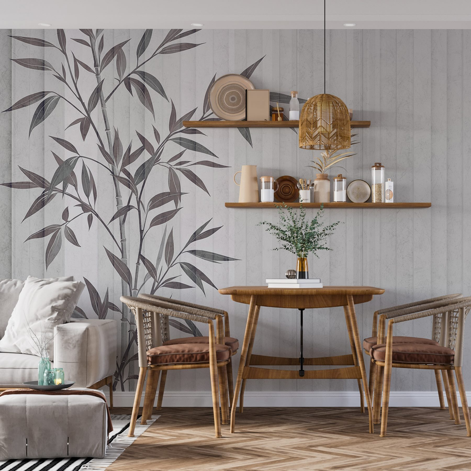 Verwandeln Sie Ihren Raum mit dieser bezaubernden Fototapete, die ein zartes Pflanzendesign vor einem weichen, gestreiften Hintergrund zeigt. Es ist, als ob man sich ein Stück Natur ins Haus holt, nur ohne die lästigen Käfer. Stellen Sie sich vor, wie Sie inmitten dieser beruhigenden Atmosphäre Ihren Morgenkaffee schlürfen oder sich mit einem guten Buch zurückziehen. Die sanften Farbtöne und die eleganten Blätter schaffen eine warme, einladende Atmosphäre, die sich für jeden Raum eignet. Es ist fast so, als hätte man eine ruhige Gartenwand – ohne dass man einen grünen Daumen braucht. Perfekt für alle, die sich einen Hauch von Natur wünschen, ohne sich zu verpflichten.