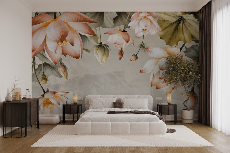 Verwandeln Sie Ihren Raum in eine heitere Oase mit dieser atemberaubenden Fototapete mit zarten Blüten in sanften Farbtönen. Die wunderschönen Blüten scheinen anmutig über Ihre Wand zu tanzen und schaffen eine beruhigende Atmosphäre, die sofort die Stimmung aufhellt. Stellen Sie sich vor, Sie schlürfen Ihren Morgenkaffee, umgeben von der ruhigen, sanften Präsenz dieser Blumen – perfekt für jeden Raum, der ein wenig Liebe braucht. Jedes Blütenblatt und jedes Blatt strahlt Wärme aus, so dass man sich selbst an grauen Tagen wie bei einem Spaziergang durch einen sonnigen Garten fühlt. Was gibt es Schöneres, als sich diese wohltuende Natur ins Haus zu holen? Es ist nicht nur Dekoration, es ist ein Stück Natur für Ihr Zuhause.