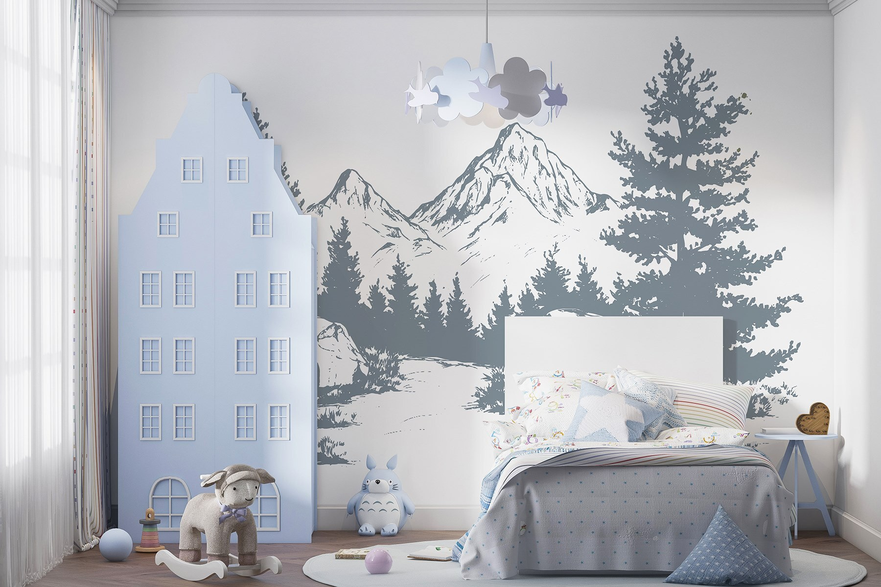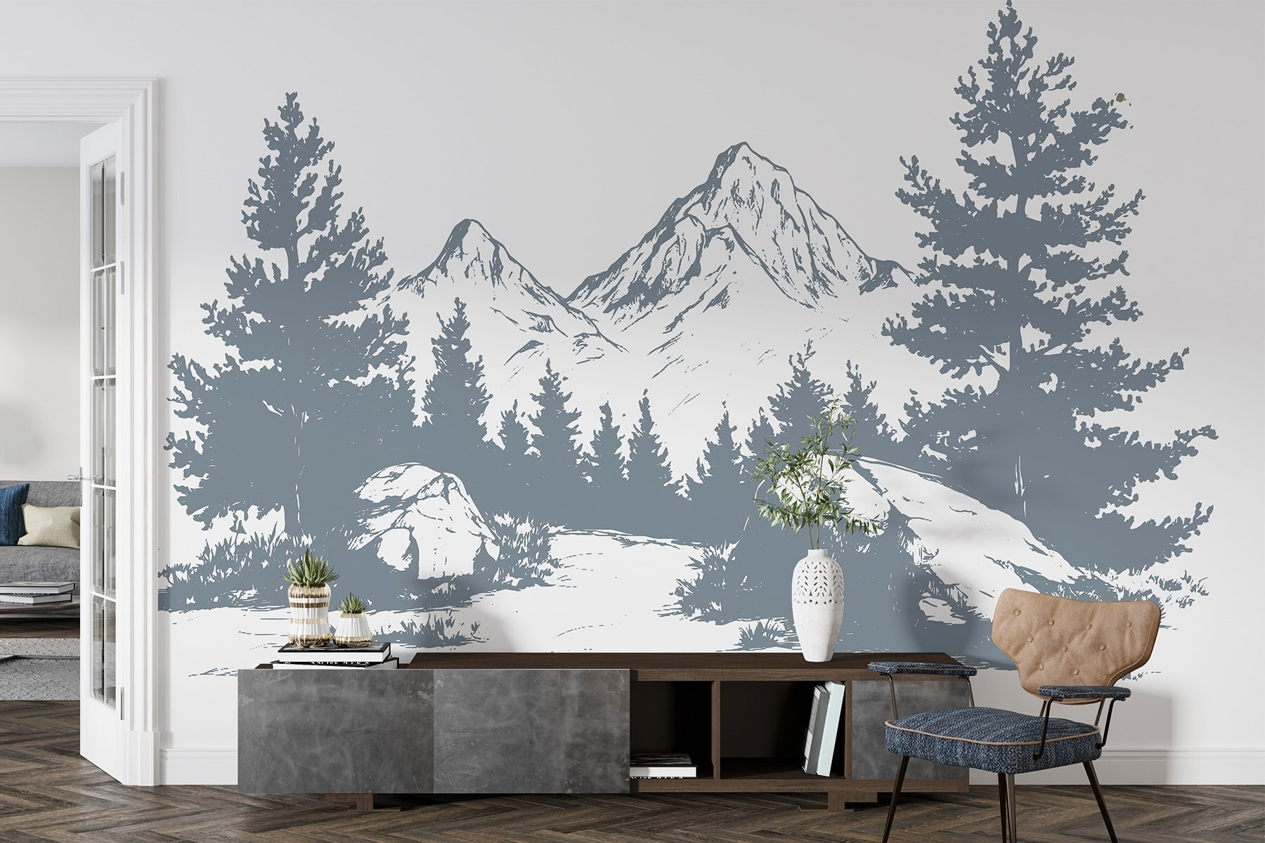 Mit diesem Wandbild einer majestätischen Gebirgskette, die von üppigen Bäumen und schroffen Felsen umgeben ist, verwandeln Sie jeden Raum in einen ruhigen Rückzugsort. Es ist, als würde man sich ein Stück Natur ins Haus holen – perfekt für eine gemütliche Leseecke oder die leere Wand, auf die man schon lange starrt und sich fragt, was man damit anfangen soll. Stellen Sie sich vor, Sie schlürfen einen Kaffee und träumen von einer Wanderung in diesen Bergen. Die sanften Farbtöne und die raffinierten Details werden Ihre Fantasie anregen, so dass jeder Blick wie ein kleiner Ausflug wirkt. Das ist Natur ohne schlammige Stiefel – nur pure Ruhe und Stil!