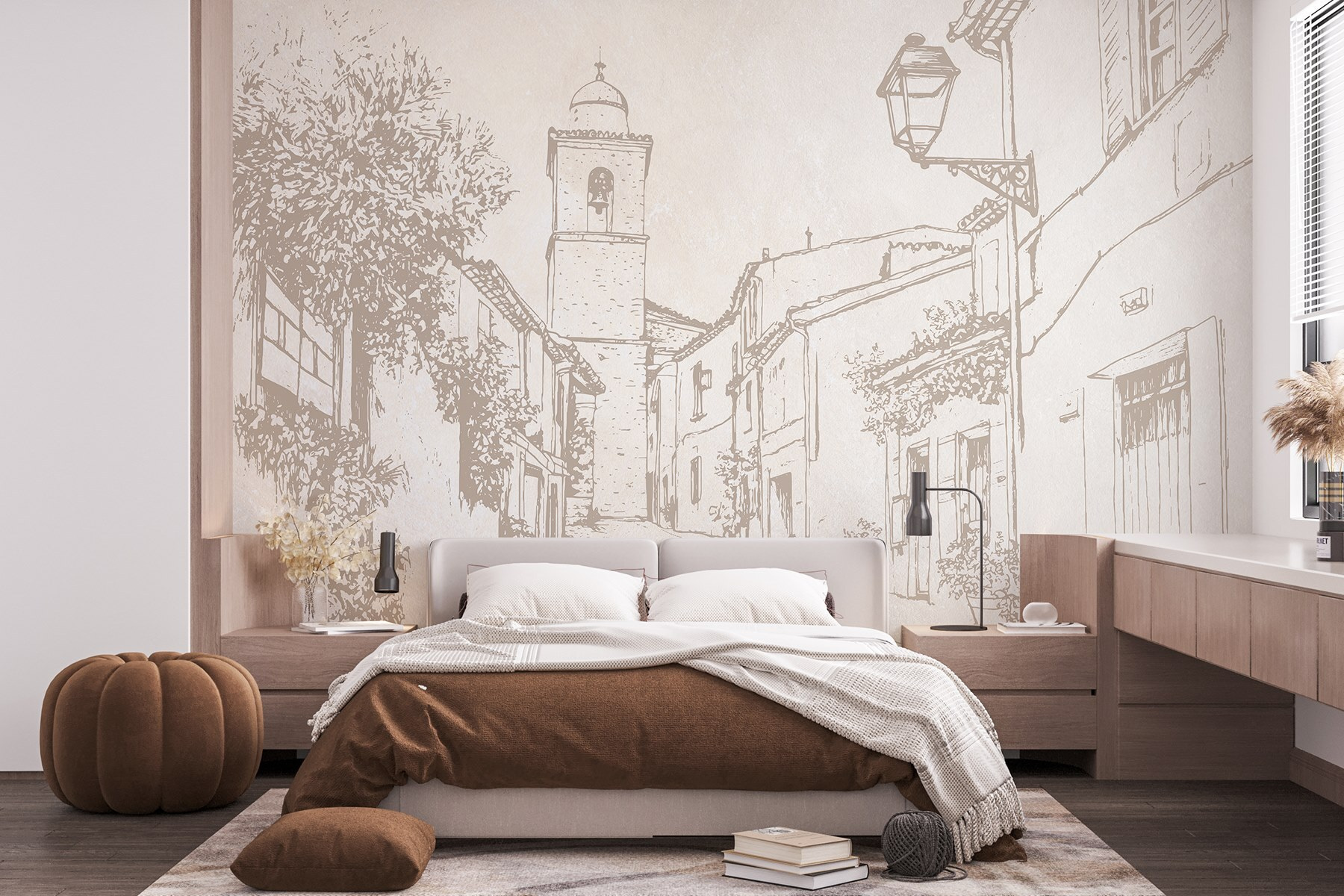 Verwandeln Sie jeden Raum in einen charmanten Zufluchtsort mit dieser Fototapete, die eine malerische Straßenszene mit einem Glockenturm zeigt. Stellen Sie sich vor, wie Sie den Kopfsteinpflasterweg entlanggehen und der Duft von frischem Gebäck durch die Luft weht. Diese Fototapete lädt Sie ein, von sonnigen Nachmittagen und freundlichen Nachbarn zu träumen. Die skurrilen Linien und sanften Farbtöne schaffen eine beruhigende Atmosphäre, die sich perfekt für einen Wohnbereich oder eine gemütliche Ecke eignet. Es ist, als hätte man ein Stück eines europäischen Dorfes direkt in seinem Zuhause – ideal, um bei einer Tasse Kaffee Gespräche zu führen, die das Fernweh wecken.