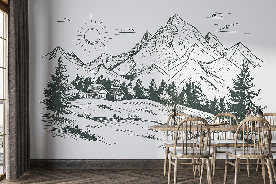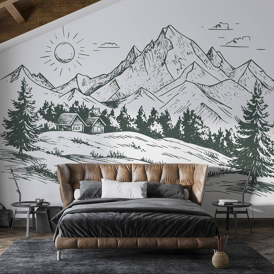 Verwandeln Sie eine leere Wand in einen ruhigen Zufluchtsort mit diesem fesselnden Wandbild, das ein bezauberndes Haus inmitten großer Berge und üppiger Bäume zeigt. Stellen Sie sich vor, Sie wachen mit einer sanften Erinnerung an die Schönheit der Natur direkt in Ihrem Wohnzimmer oder Ihrem Büro auf. Die klaren Linien und die erdigen Töne schaffen eine friedliche Atmosphäre, die perfekt ist, um sich nach einem langen Tag zu entspannen. Es ist, als würde man sich die Natur ins Haus holen, nur ohne die Mücken. Ob es sich um eine gemütliche Leseecke oder einen einladenden Raum für Freunde handelt, diese Fototapete sorgt für die richtige Stimmung. Wer würde sich im Alltag nicht gerne ein bisschen mehr Zen wünschen?