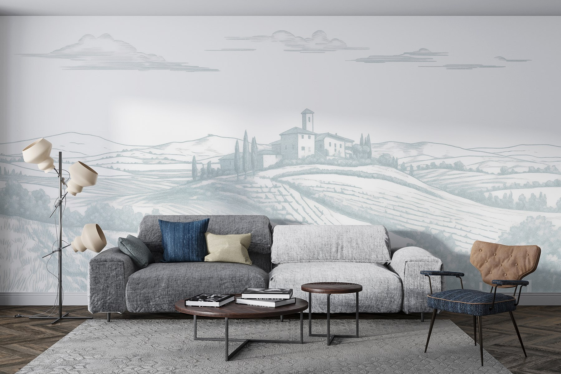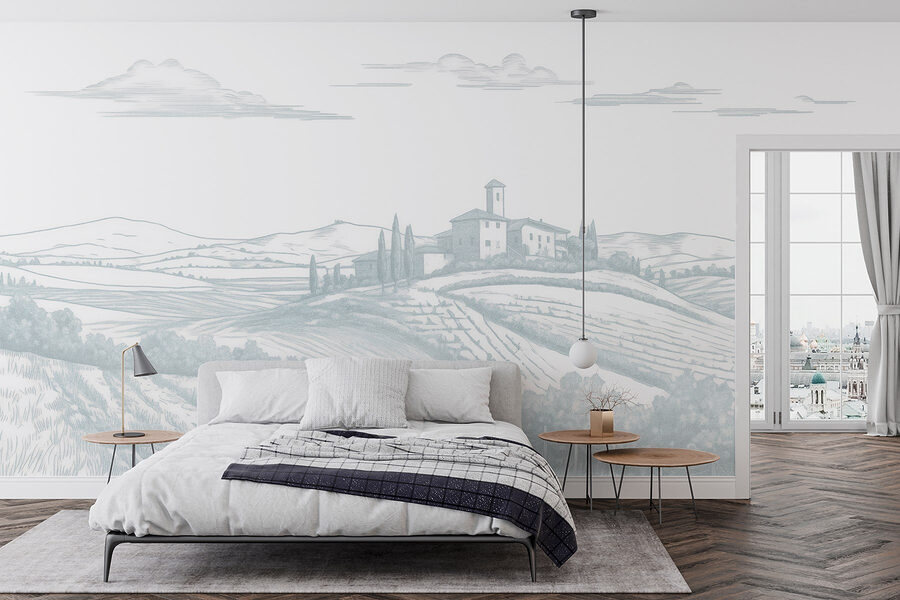 Verändern Sie jeden Raum mit dieser fesselnden Fototapete, die eine ruhige Landschaft mit einem charmanten Haus und anmutigen Bäumen zeigt. Stellen Sie sich vor, Sie betreten einen Raum und fühlen sich sofort in eine sanfte Hügellandschaft und eine sonnenbeschienene Wiese versetzt. Die sanften Umrisse vermitteln ein Gefühl der Ruhe und eignen sich perfekt für eine gemütliche Leseecke oder einen lebhaften Arbeitsbereich. Stellen Sie sich vor, Sie nippen an Ihrem Kaffee, während Sie die neue Aussicht betrachten und die Ruhe einatmen. Es ist wie ein kleiner Urlaub direkt zu Hause! Diese Fototapete dekoriert nicht nur, sie schafft eine Atmosphäre, die Entspannung verspricht.
