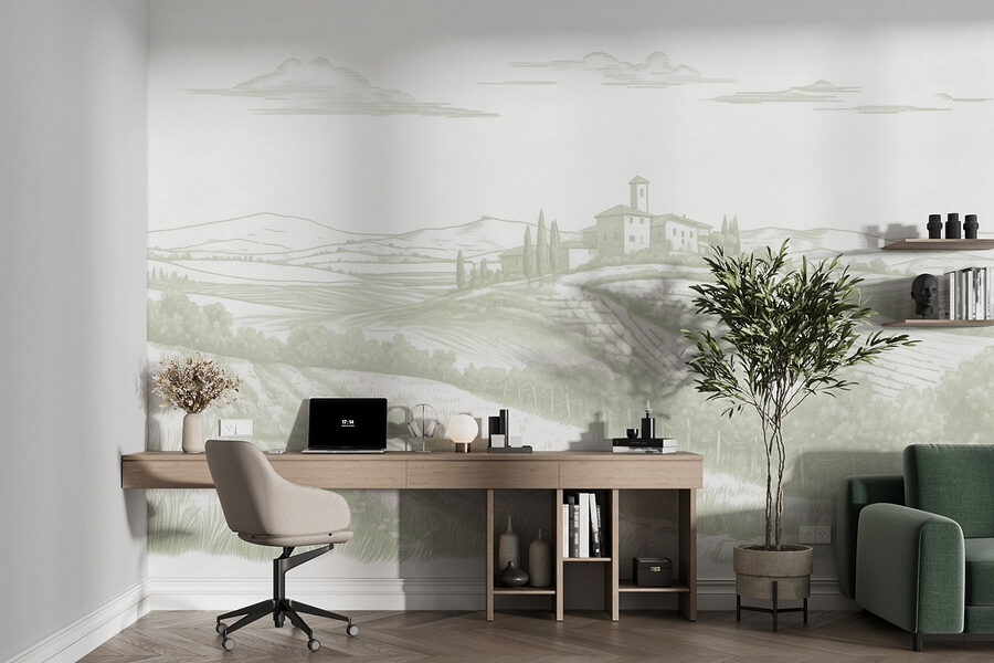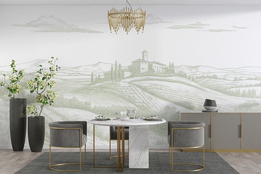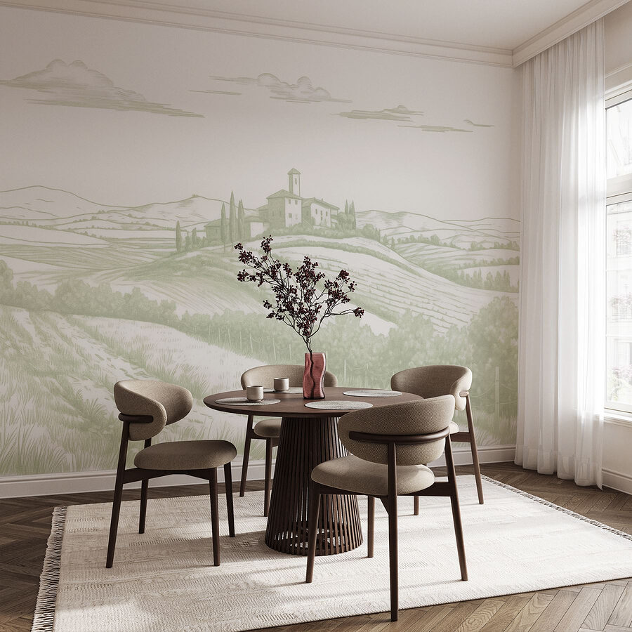 Verwandeln Sie jeden Raum in einen friedlichen Rückzugsort mit dieser wunderschönen Fototapete, die eine ruhige Landschaft zeigt. Stellen Sie sich diese sanften Hügel vor, ein charmantes Haus, das sich an die Landschaft schmiegt, und Felder, die sich wie eine warme Umarmung erstrecken. Es erinnert an einen verträumten Wochenendausflug aufs Land – genau das Richtige, um den Alltag ein wenig zu entschleunigen. Die sanften Farbtöne strahlen eine Ruhe aus, der man sich nur schwer entziehen kann. Es ist, als würde man sich die frische Luft und die Ruhe der Natur direkt nach Hause holen, ohne Allergien und Insektenstiche. Wer wünscht sich nicht ein kleines Stückchen Paradies, das man beim Kaffeetrinken bewundern kann?