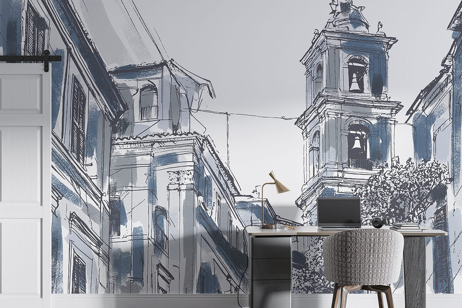 Wir stellen Ihnen ein Wandbild vor, das Geschichten von Charme und Geschichte erzählt – eine verträumte Zeichnung eines Gebäudes mit Glocken, die nur darauf wartet, jeden Raum zu verwandeln. Stellen Sie sich vor, wie diese Schönheit Ihren Raum erhellt und ein bisschen von der malerischen Atmosphäre der alten Welt direkt an Ihre Wände bringt. Es ist, als würde man eine bezaubernde europäische Straße betreten, in der jeder Blick einen Tagtraum auslöst.