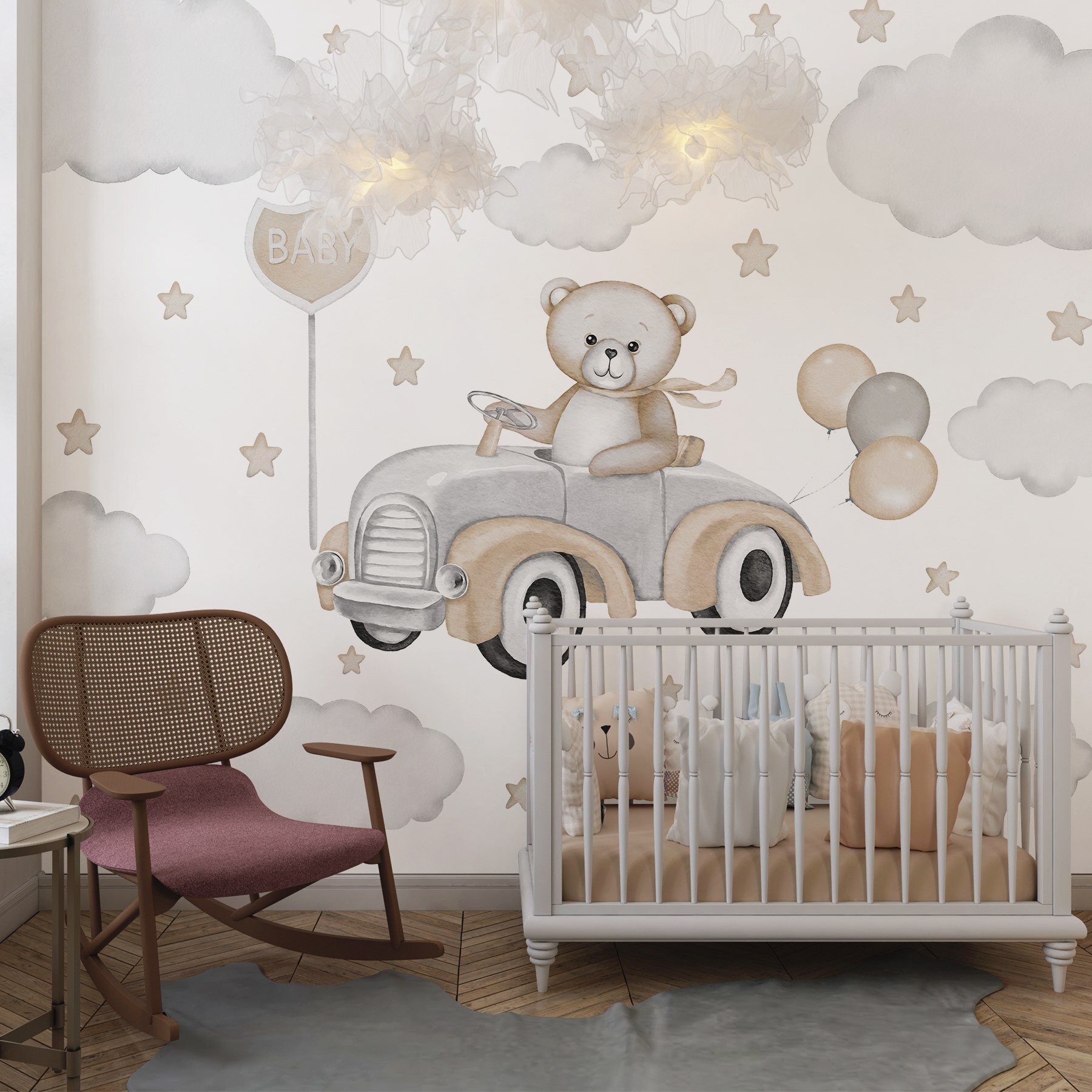 Bringen Sie ein wenig Freude in das Zimmer Ihrer Kleinen mit dieser entzückenden Fototapete, die einen Teddybären auf einem charmanten Abenteuer zeigt! Stellen Sie sich den Plüschbären hinter dem Steuer vor, mit einem Luftballon in der Hand, der durch sanfte Wolken und glitzernde Sterne navigiert. Es ist die Art von Szene, die die Schlafenszeit ein wenig magischer und verträumter macht. Dieses Wandbild eignet sich perfekt, um die Fantasie anzuregen und verwandelt jeden Raum in einen skurrilen Rückzugsort. Es ist, als hätte man einen freundlichen Co-Piloten, der fröhlich über das Kind wacht und einen gemütlichen Rückzugsort voller Wunder und Lachen schafft. Genau das Richtige für das Zimmer einer Tochter oder ein Kinderzimmer – lustig und doch beruhigend, so wie sich Kindheit anfühlen sollte!