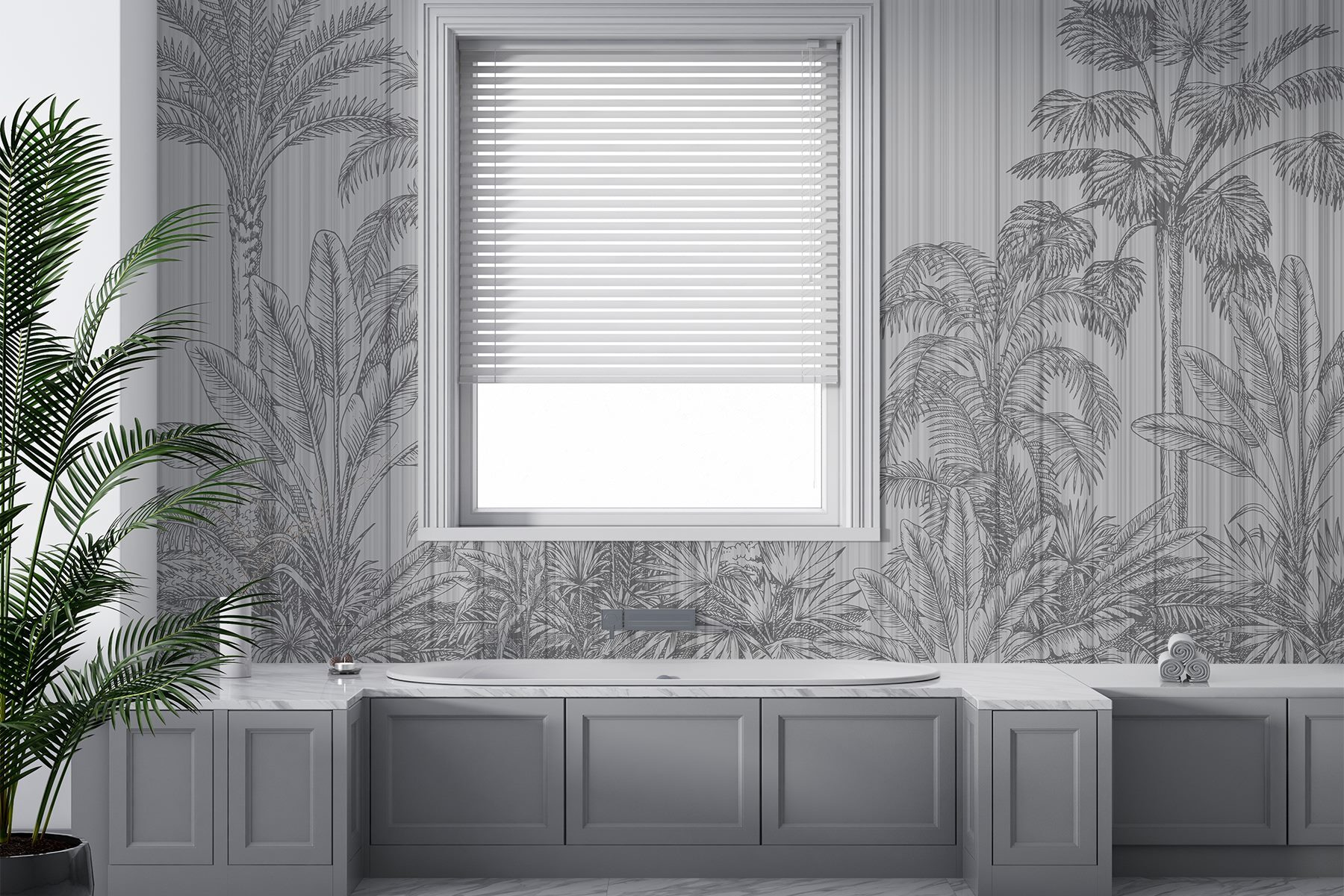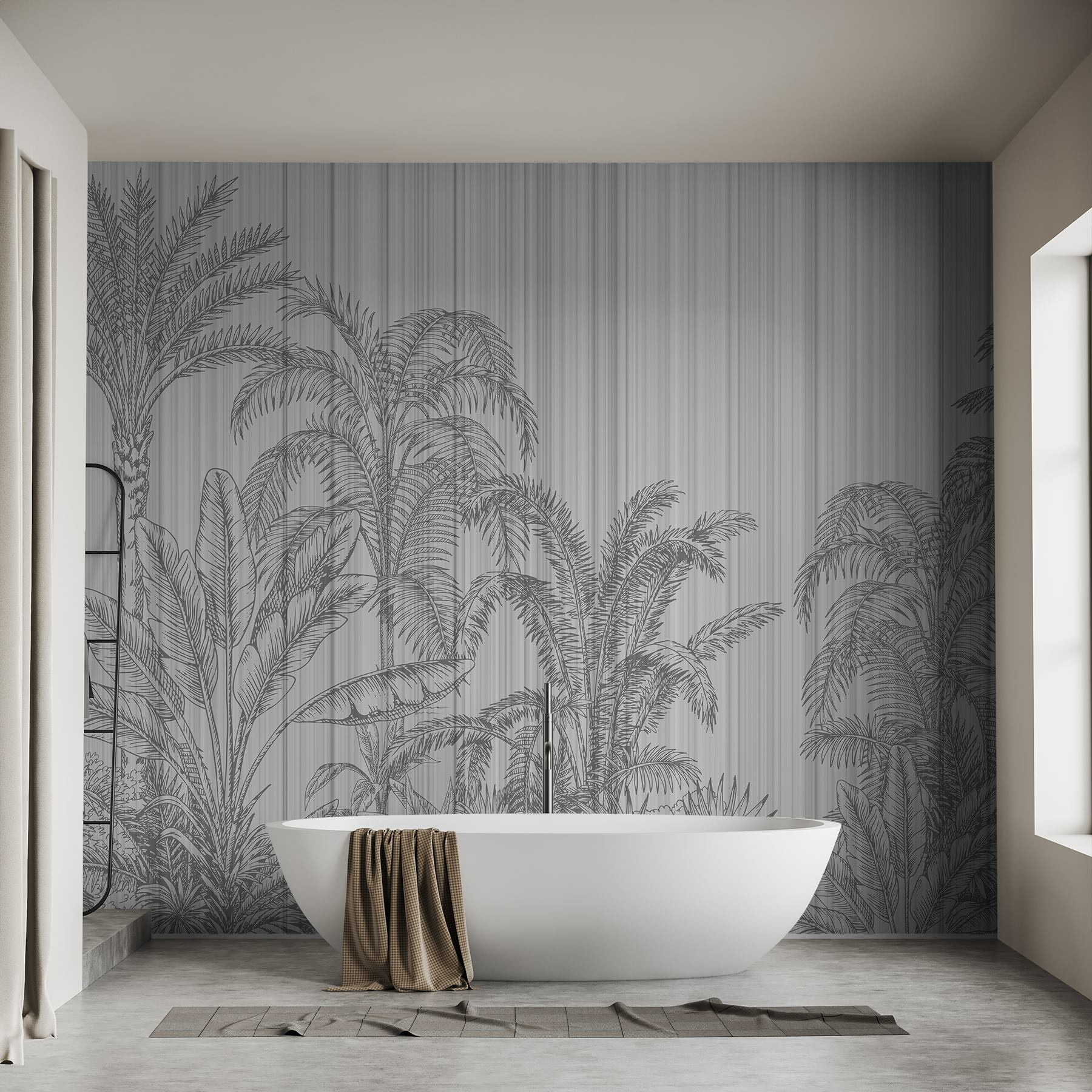 Verwandeln Sie Ihren Raum mit dieser atemberaubenden Fototapete, die eine tropische Oase schafft, ohne dass Sie sich mit Sonnencreme eincremen müssen. Der grau-weiße Hintergrund mit Palmen verleiht einen Hauch von ruhiger Raffinesse. Stellen Sie sich vor, Sie betreten Ihr Zimmer und fühlen sich sofort wie auf einer ruhigen Insel.