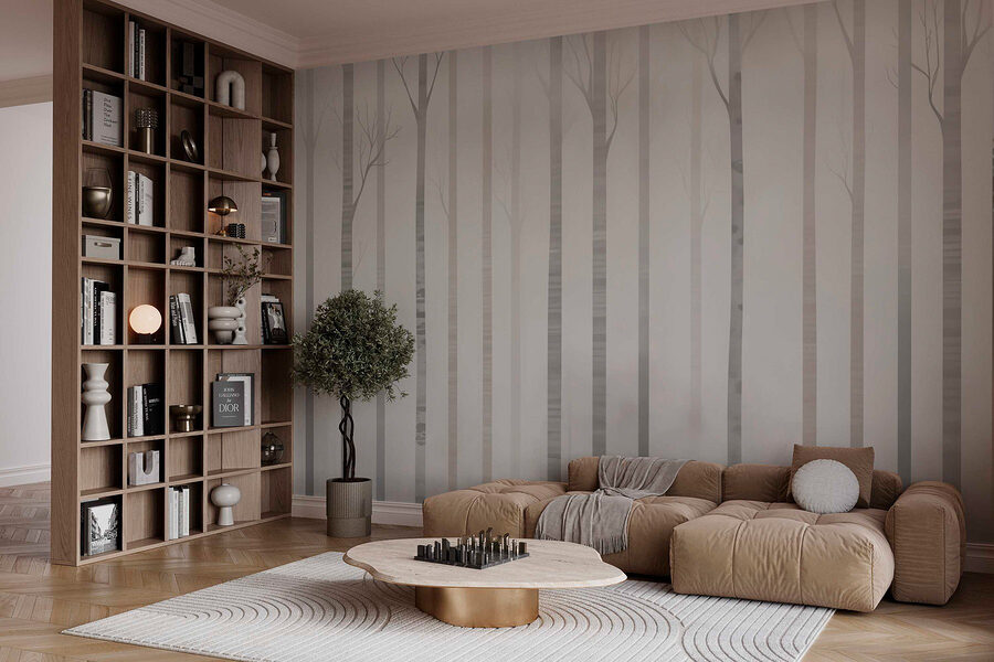Treten Sie ein in eine verträumte Welt mit diesem Wandbild, das eine ruhige, in sanften Nebel gehüllte Baumgruppe zeigt. Es ist, als hätten Sie ein Stück Natur direkt in Ihrem Wohnraum, ohne Gefahr zu laufen, in Schlamm zu treten. Stellen Sie sich vor: Sie machen es sich mit einem guten Buch gemütlich, während die weichen, geisterhaften Stämme eine ruhige Kulisse bilden. Sie verleihen dem Raum einen luftigen Touch und lassen ihn geräumig und hell erscheinen. Perfekt für alle, die sich nach einer Verbindung zur Natur sehnen, aber auch den Komfort von zu Hause schätzen. Diese Fototapete strahlt Ruhe aus und lädt zur Kreativität ein – ein wahrer Gesprächsanlass! Wer würde nicht gerne auf einen ruhigen Wald starren, während er träumt?