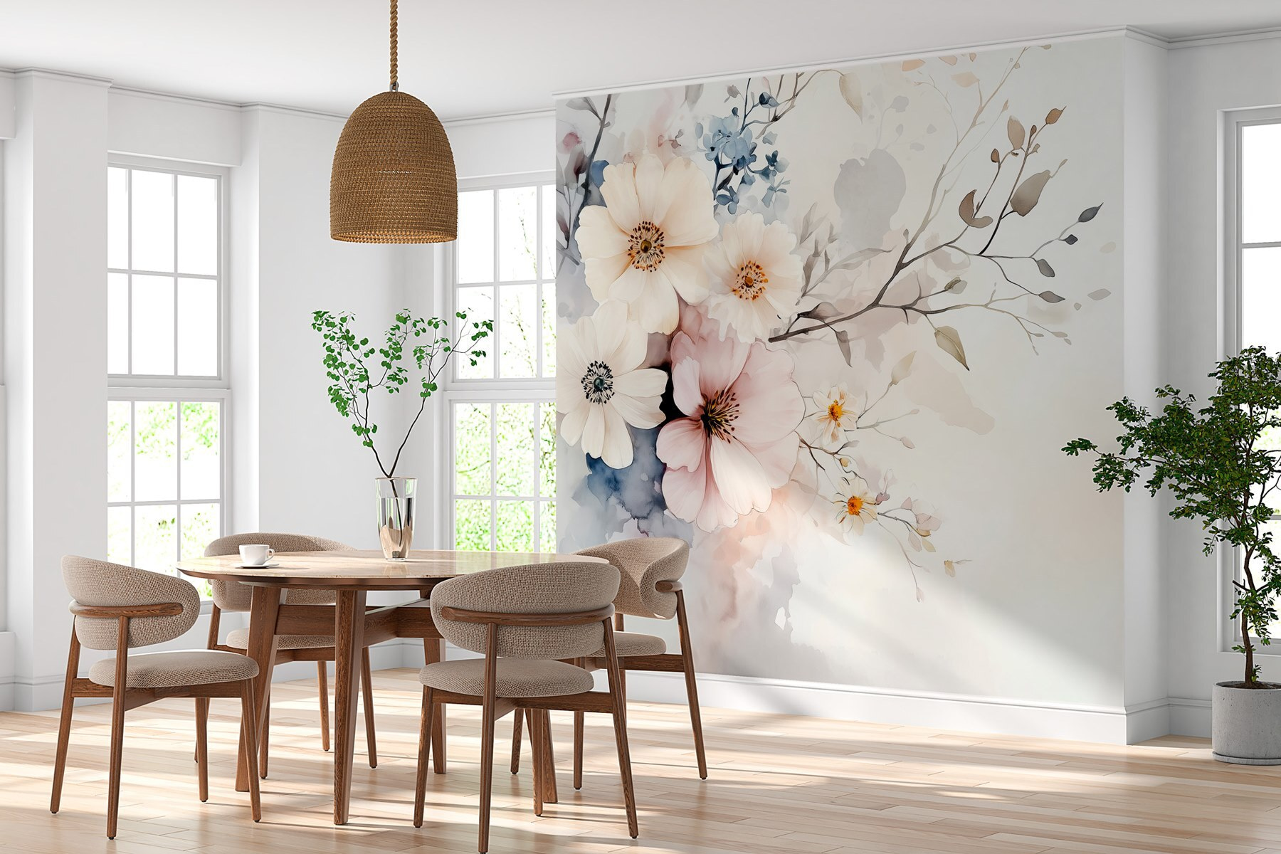 Mit dieser wunderschönen Fototapete, die ein verträumtes Blumenarrangement vor einem sanften weißen Hintergrund zeigt, können Sie jeden Raum verwandeln. Stellen Sie sich vor, Sie wachen jeden Tag mit rosa Blüten und sanftem Grün auf und fühlen sich wie bei einem Spaziergang durch einen ruhigen Garten. Perfekt für Wohnzimmer oder gemütliche Ecken, verleiht es einen Hauch von Eleganz, ohne zu auffällig zu sein. Vielleicht bleiben sogar Freunde während eines Gesprächs stehen, fasziniert von dem Kunstwerk. Es zieht die Blicke auf sich und hebt die Stimmung – perfekt, um positive Schwingungen zu verbreiten. Wer hätte gedacht, dass Blumen einen Raum so sehr verschönern können wie einen Garten?