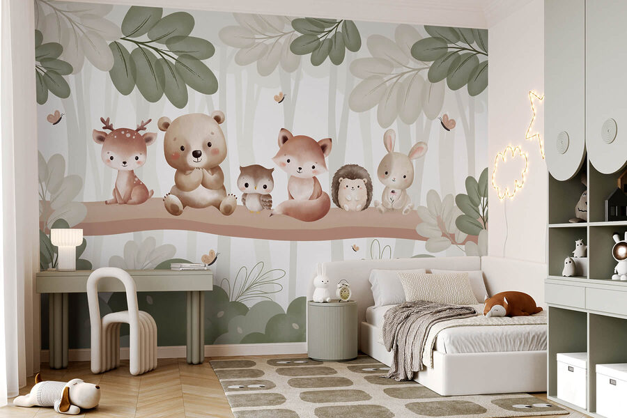 Stellen Sie sich eine gemütliche Ecke vor, die mit dem Charme einer Waldlandschaft gefüllt ist. Dieses entzückende Wandbild zeigt eine liebenswerte Gruppe von Tierfreunden, die auf einem Ast hocken und jedem Raum einen Hauch von Laune verleihen. Stellen Sie sich ein scheues Reh, einen neugierigen Bären und einen verspielten Fuchs vor, die alle inmitten von grünem Laub sitzen. Es ist die perfekte Kulisse für ein Kinderzimmer, die zu Geschichten über Abenteuer im Zauberwald anregt. Jeder Blick lädt zum Kichern und zur Fantasie ein und schafft eine Wärme, die sich wie eine Lieblingsdecke um einen legt. Verwandeln Sie das Gewöhnliche in etwas ganz Besonderes mit diesen niedlichen Waldfreunden!